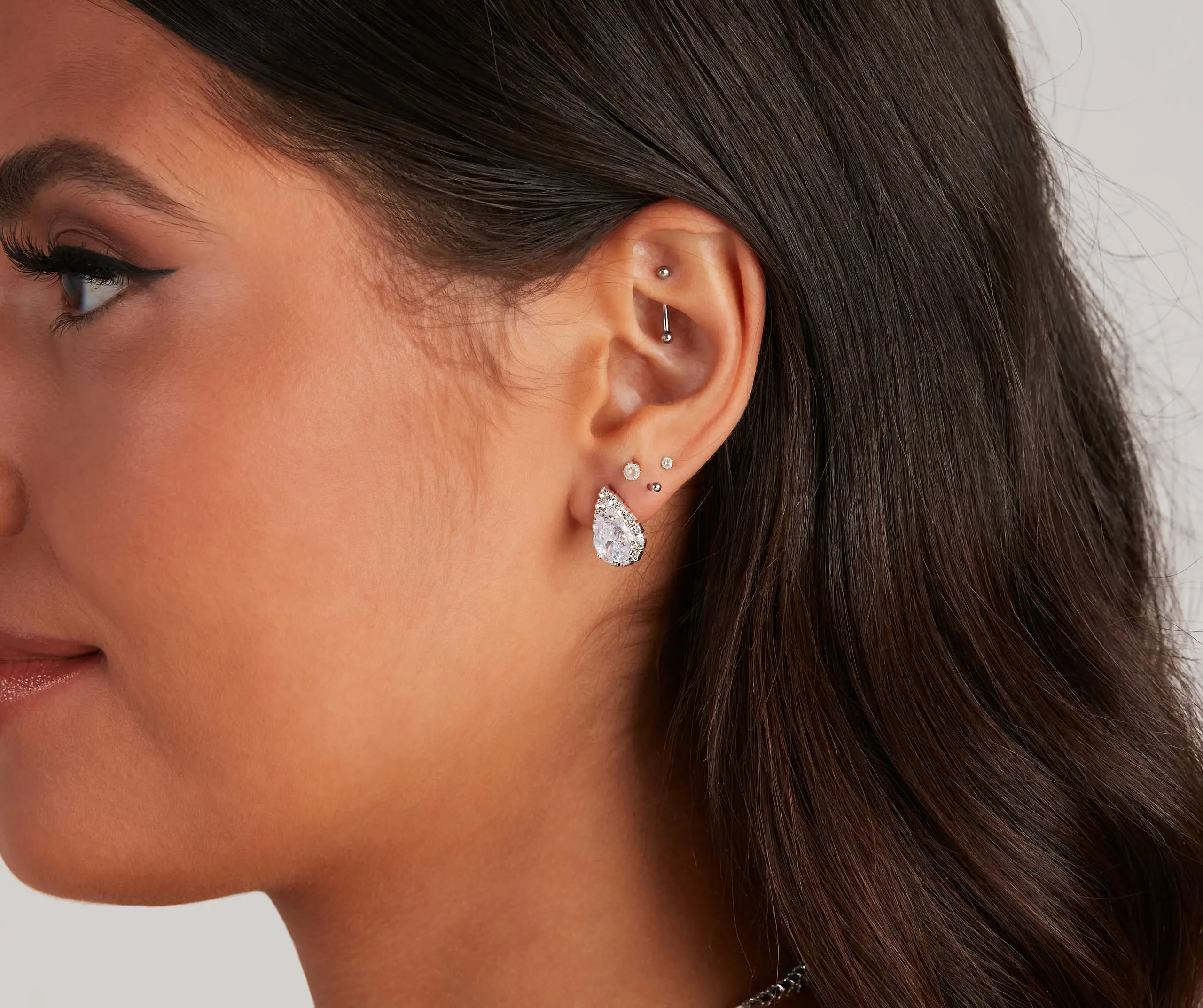 - Teardrop-shaped cubic zirconia stones, rhinestone halo trim