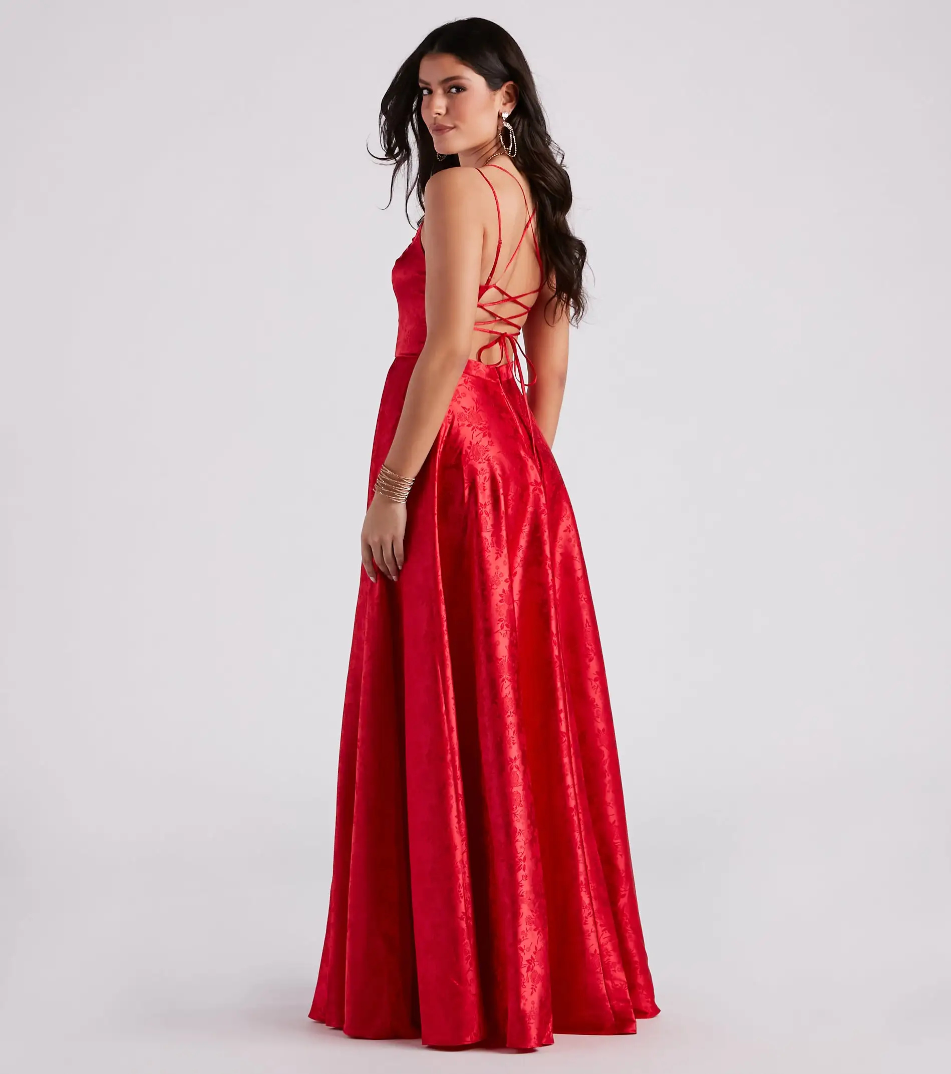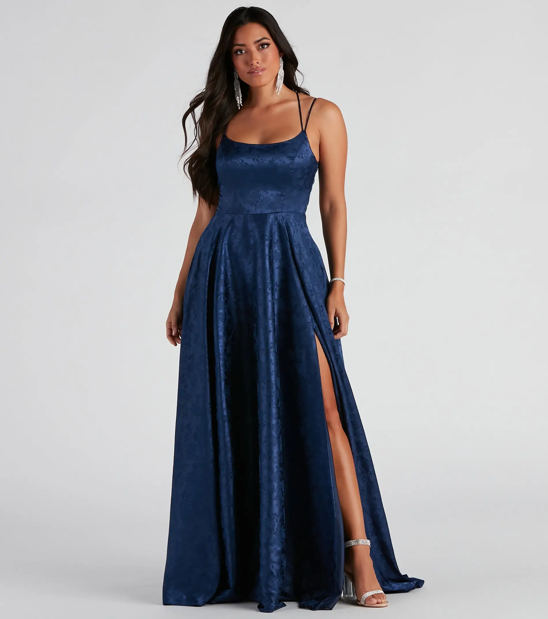 You’ll be ready to celebrate the night in the Abby formal ball gown designed to capture all the attention! She features a sleeveless boat neckline, dual adjustable spaghetti straps, and an open back with an alluring lace-up design for a customized fit. Her high waist seam effortlessly leads to the A-line silhouette with a sultry front slit to showcase some leg. The formal dress is composed of a floral jacquard woven fabric with an inner lining and no stretch. Complete your event look in a stunning