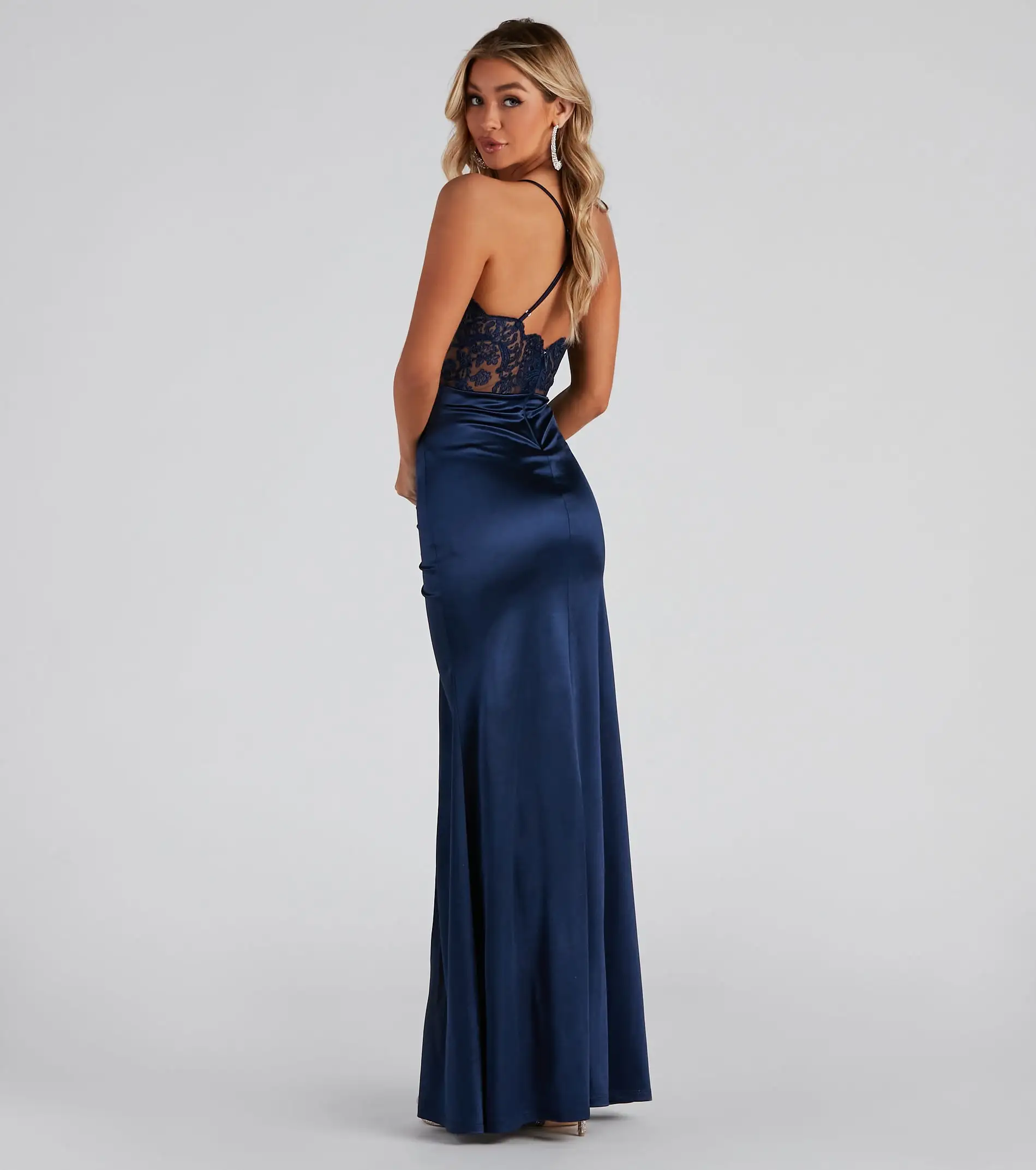 Get a stunning look in the gorgeous and chic Abigail mermaid dress! She features a sleeveless bodice, adjustable spaghetti straps that lead to a cross-back design, a V-neckline, and a sheer lace back panel with zipper closure. Her high waist leads to a curve-hugging mermaid silhouette with a floor-length skirt, front ruched detailing, and a thigh-high front slit. Pair the sleek satin dress with a