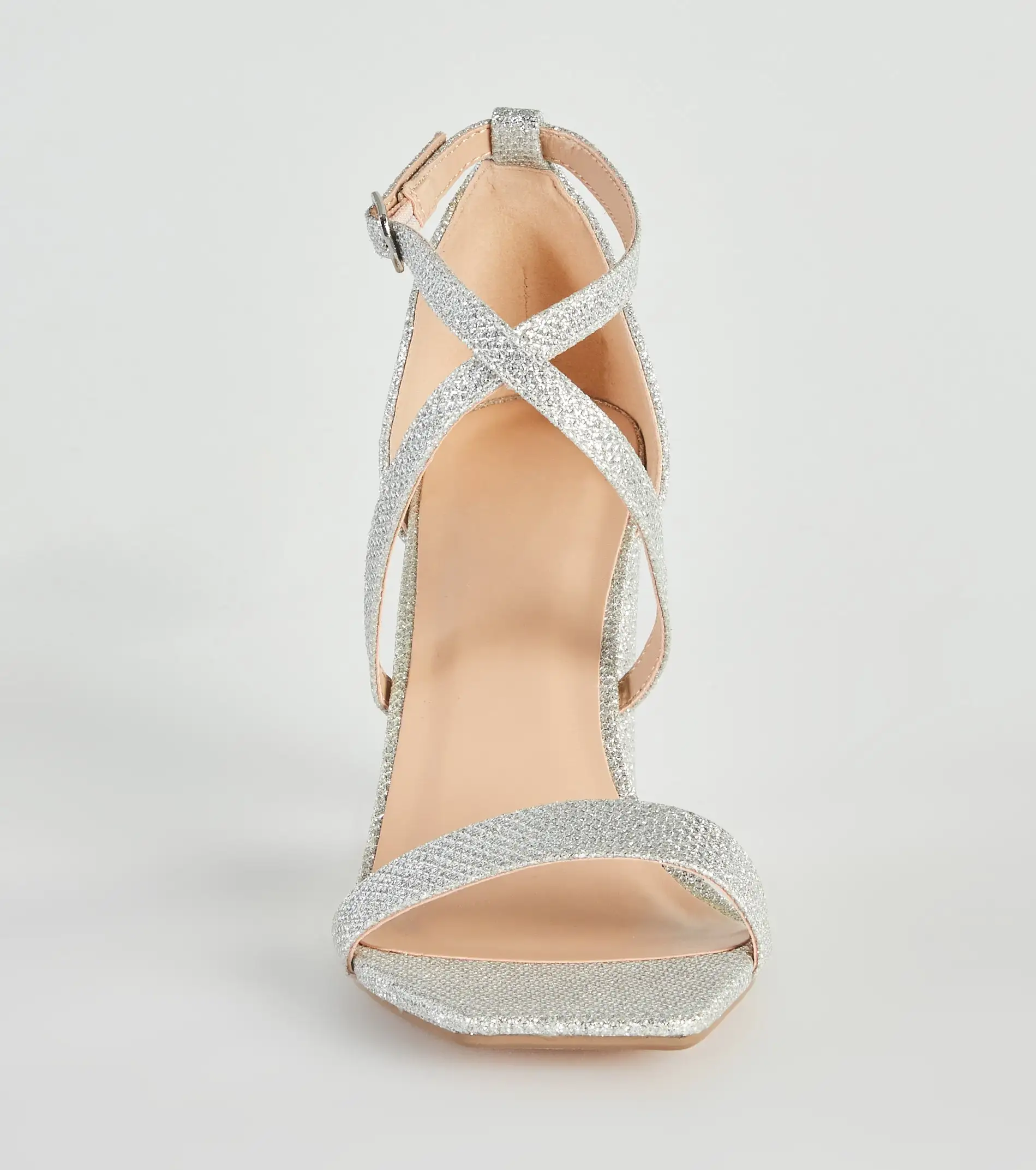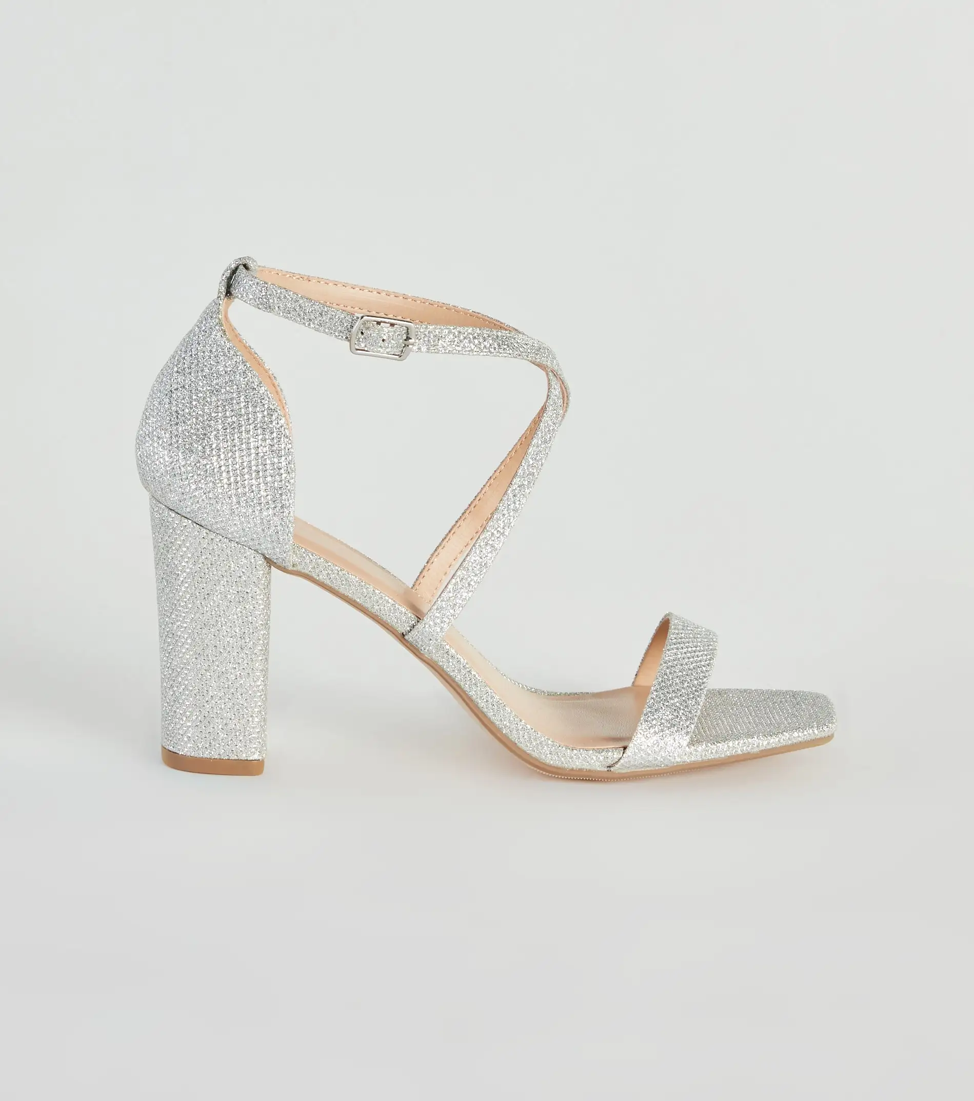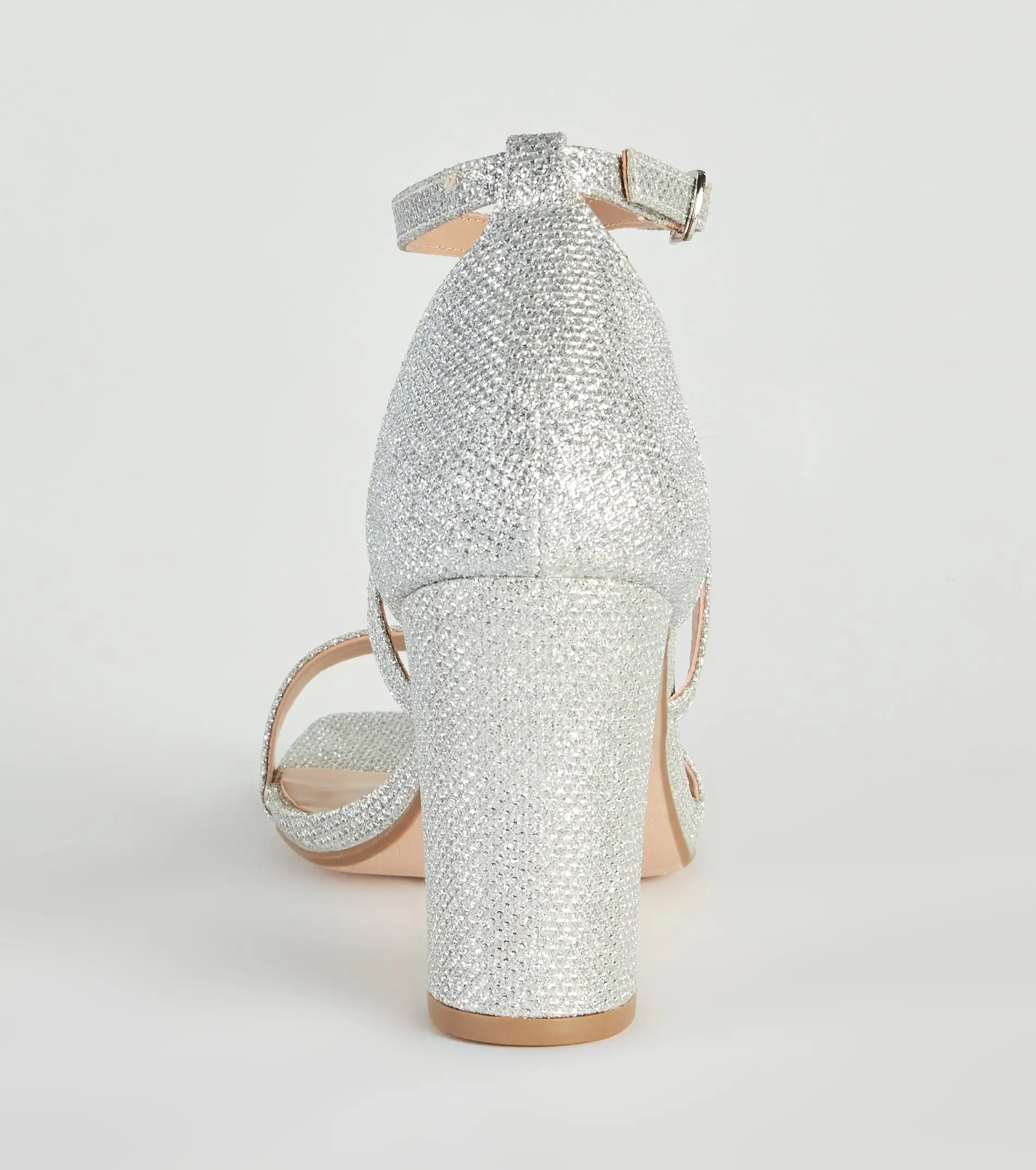 If you’re all about the sparkle these glitter mesh block heels are just the ticket! They feature a square toe, wide toe strap, crisscross ankle straps with adjustable buckle closure, and a closed ankle. Complete the look with a glam