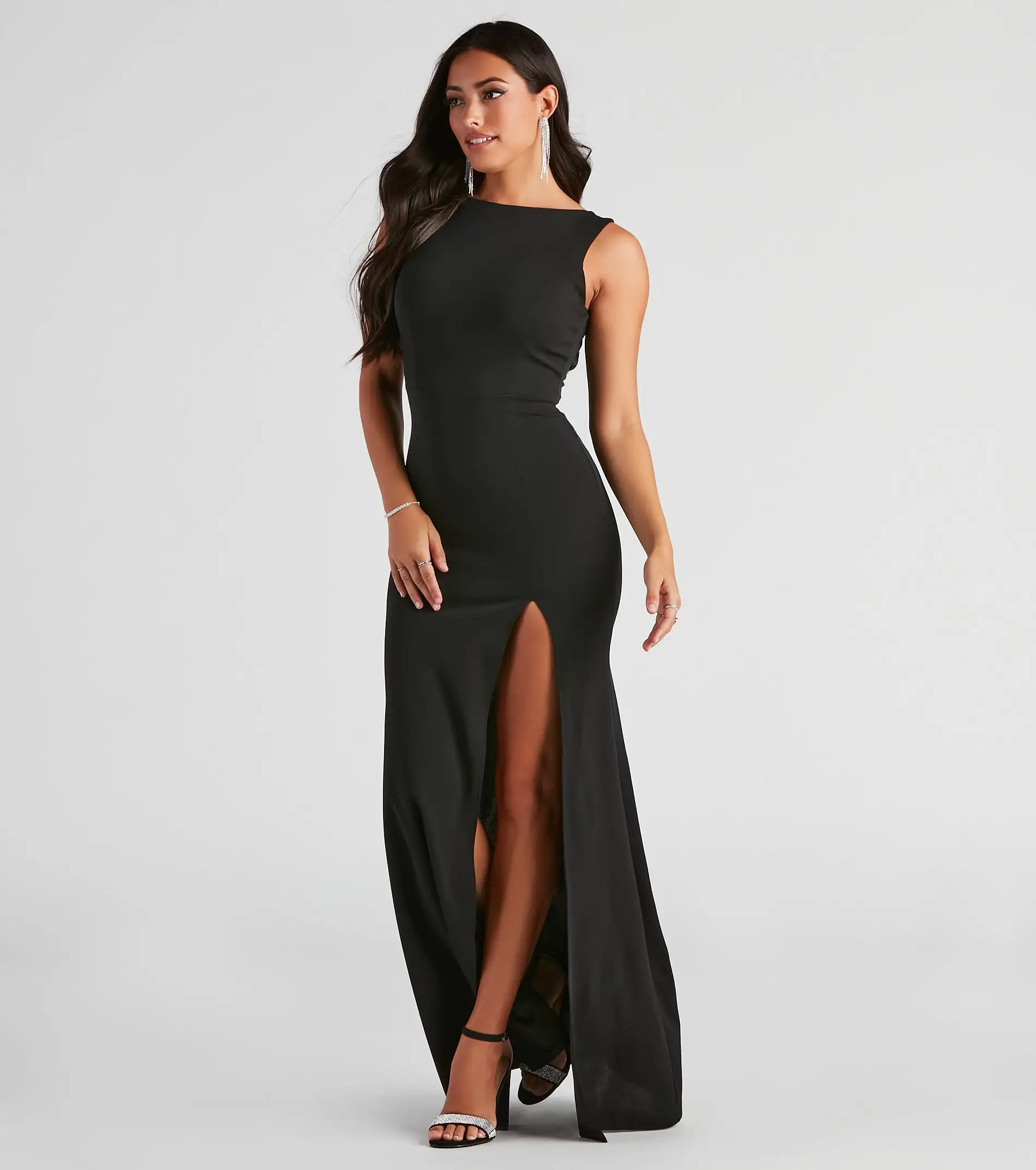Make a head-turning entrance in a dress that captivates with stunning details! Addie features a sleeveless boat neck, padded cups with vertical seams at the bust, and an   A-line silhouette with a high side slit. The back features a plunging open back with a wired V-shape boning for support and ruching at the lower back. The dress is composed of a lined crepe fabric that offers a form hugging fit with a moderate stretch. Complete look with