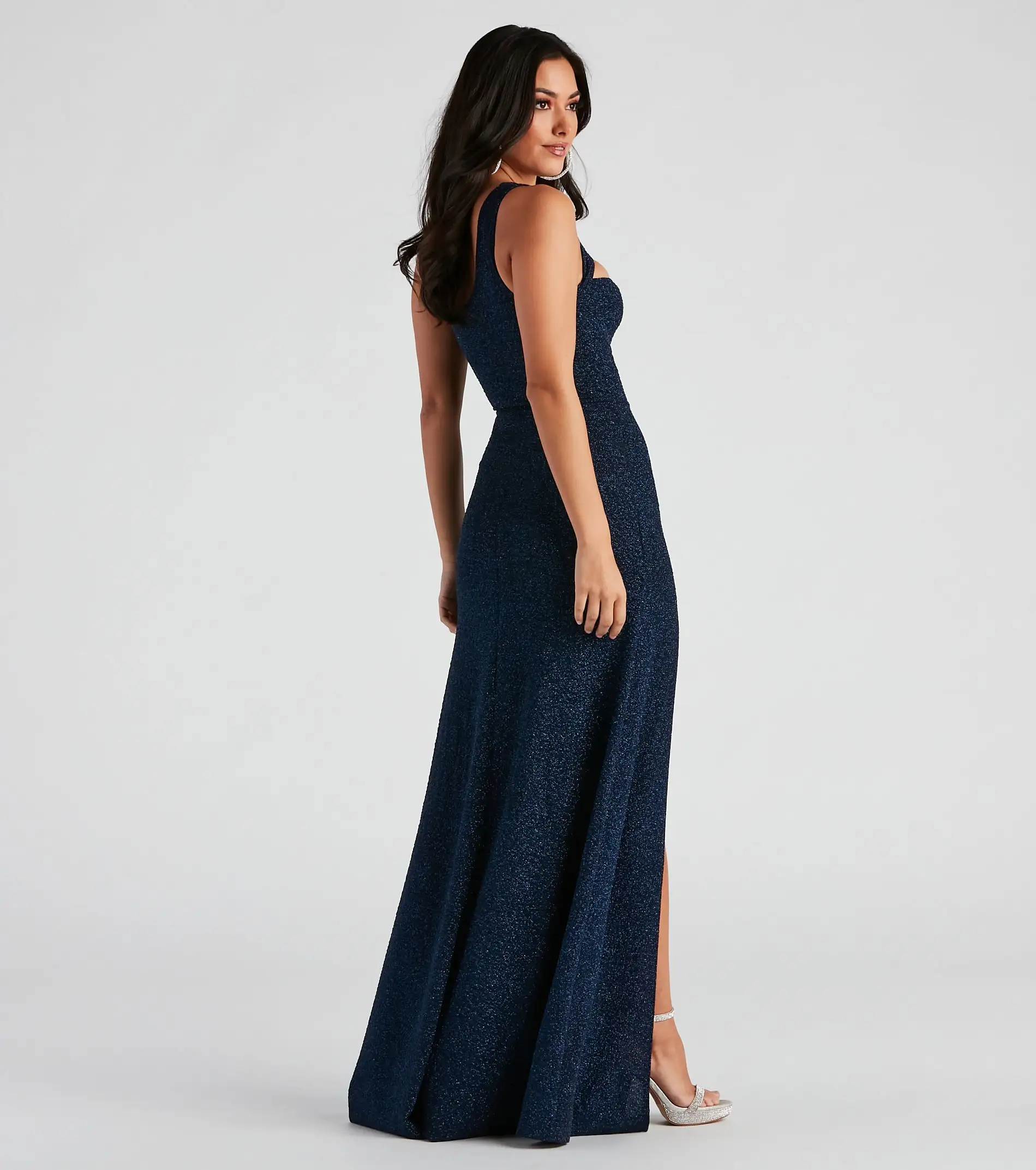 The Alanna glitter knit formal dress will give you a sultry silhouette while showcasing glamorous details. She features an asymmetric one-shoulder neckline with a tank shoulder strap, an alluring bust cutout, a fitted bodice leading to a floor-length A-line silhouette, and a chic thigh-high front slit to show off your heels. The glitter knit fabric has a gorgeous shimmer and offers a moderate stretch. Style with
