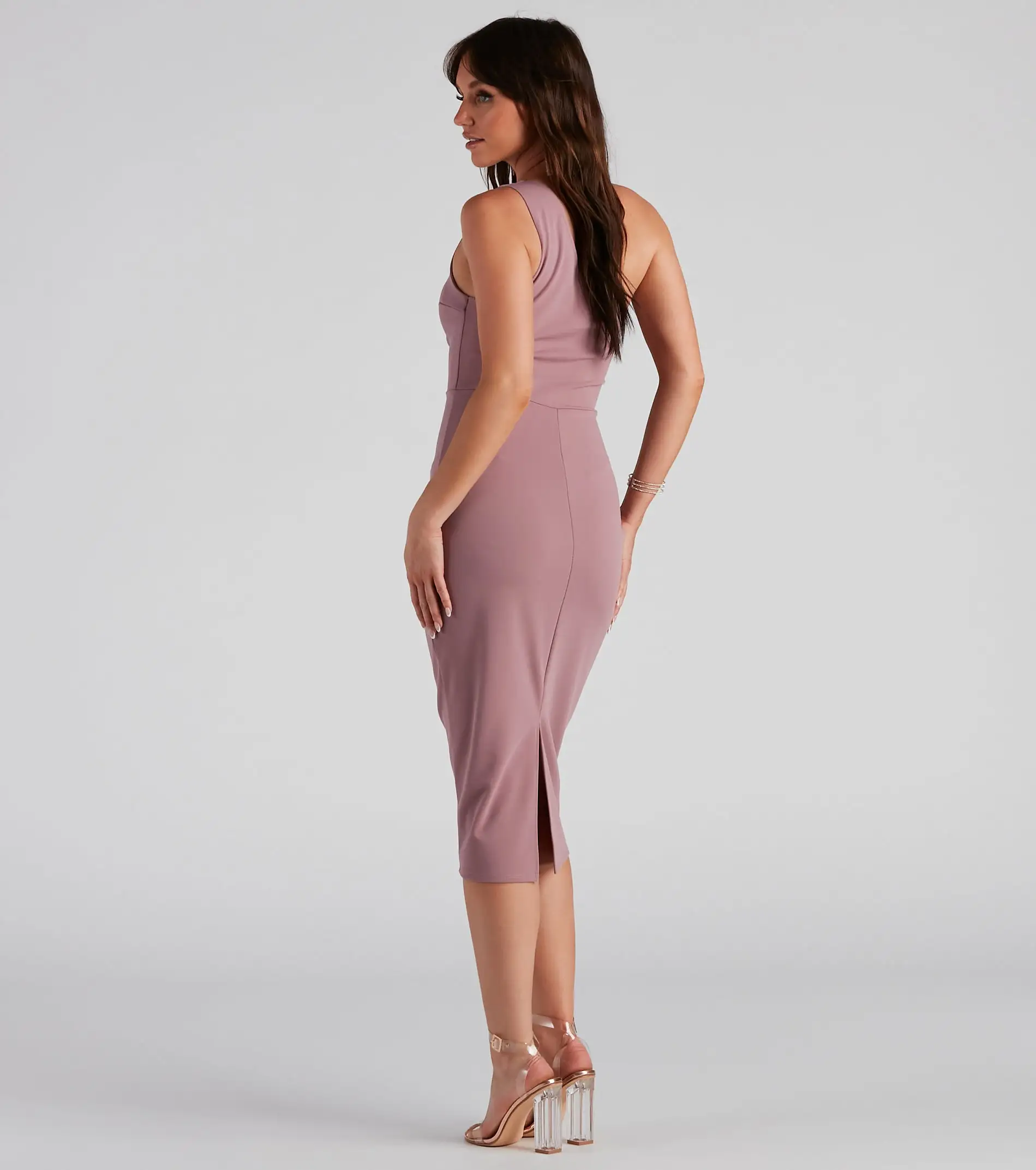 Make an elegant entrance in the Alessandra formal midi dress that captivates from the moment you enter the room. She features a sleeveless one-shoulder neckline with a single tank shoulder strap, front ruched detailing, and a fitted midi-length silhouette with a chic back slit. The dress is composed of a lined crepe fabric that offers a form-hugging fit with a moderate stretch. Complete the look with rhinestone heels and an