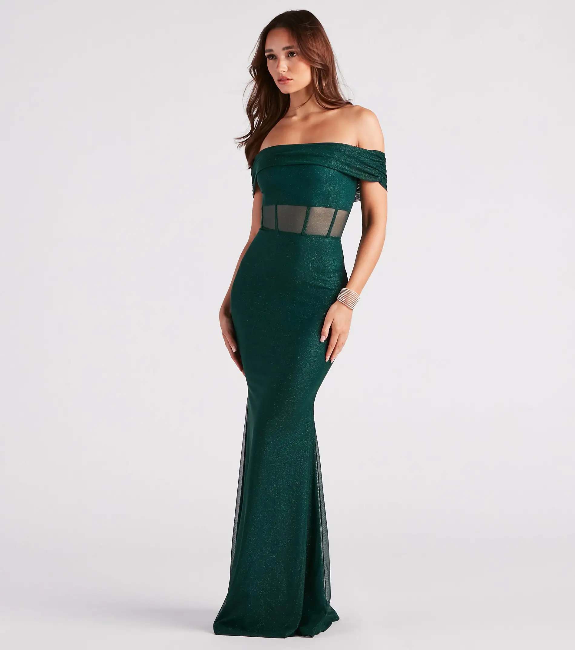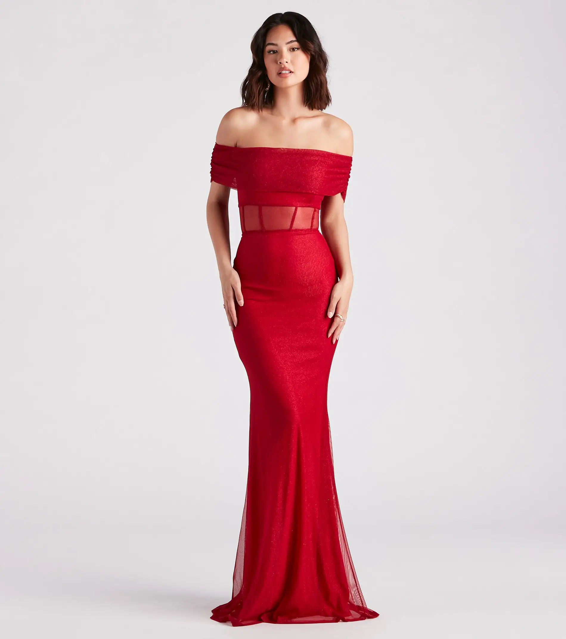 It’s not a party til you arrive in the sparkly Alice formal dress showcasing all-over glitter! Shine and shimmer at school dances, red-carpet events, and galas. She features a sultry fold-over off-the-shoulder neckline, a corset-style bodice, and a form-hugging mermaid silhouette with a floor-length hem. The formal dress is composed of a glitter mesh fabric with a stretchy knit lining. Complete the look with
