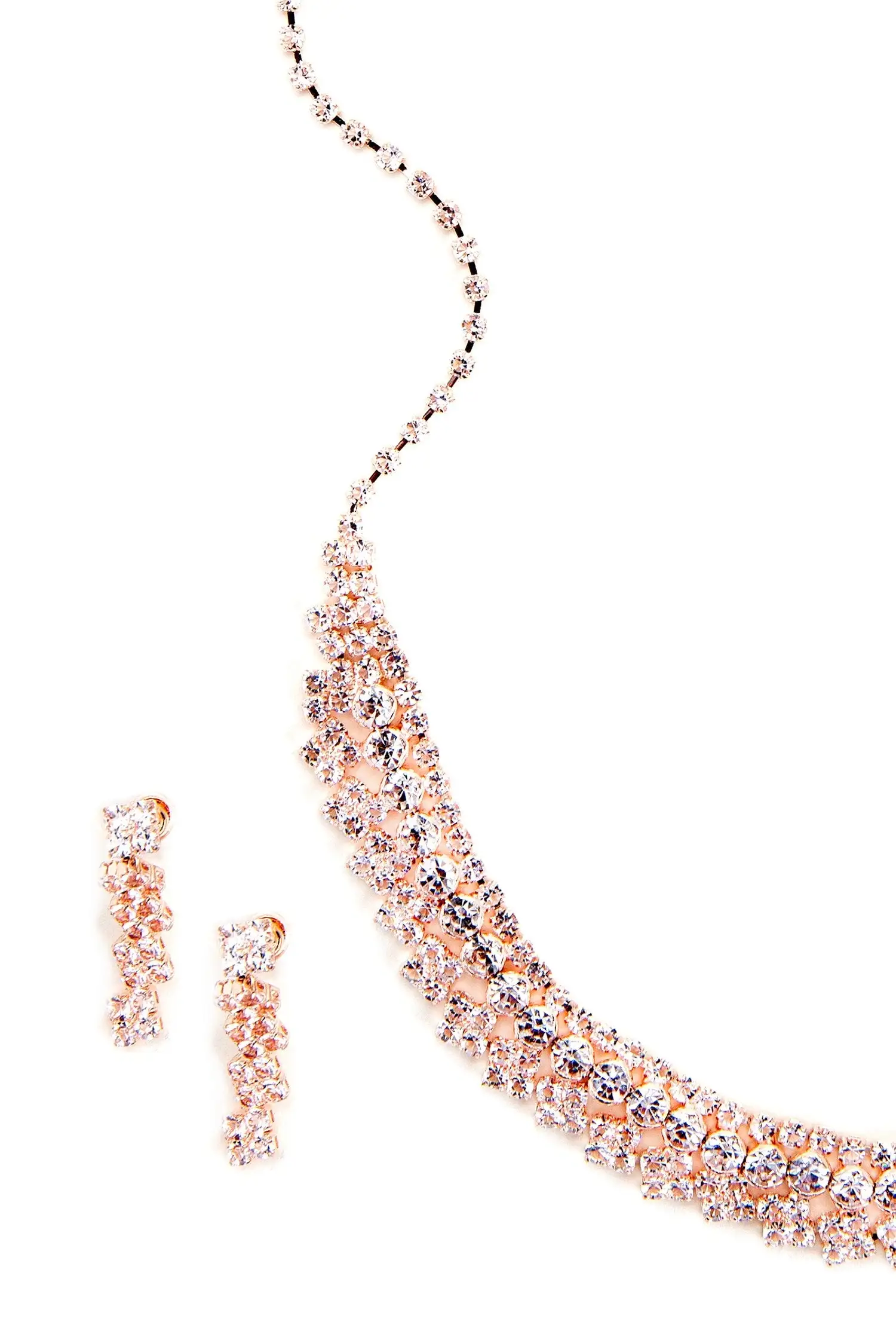 Get all glammed up with this gorgeous necklace and earrings set! It features a collar necklace adorned with shimmering cubic ziconia stones in an intricate design, as well as the matching pair of long duster earrings. Necklace has adjustable lobster clasp closure and earrings include post back closure.