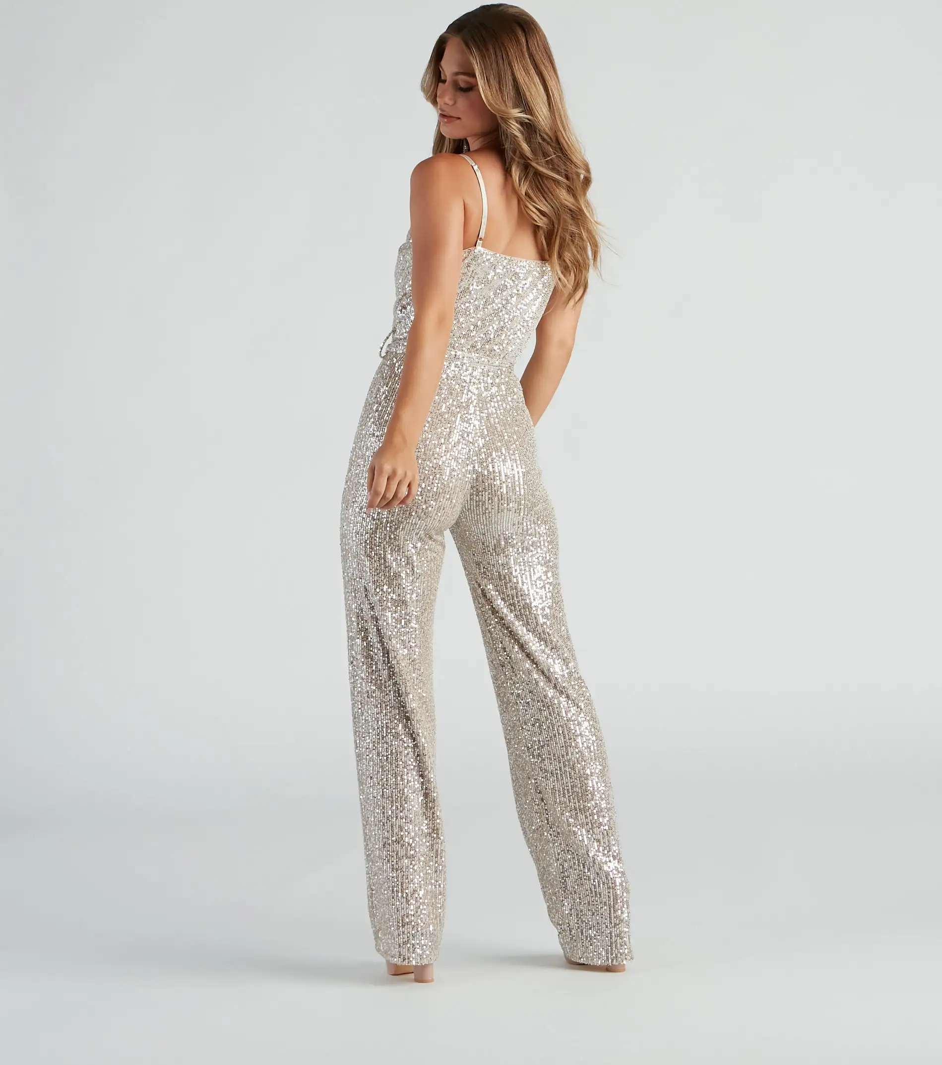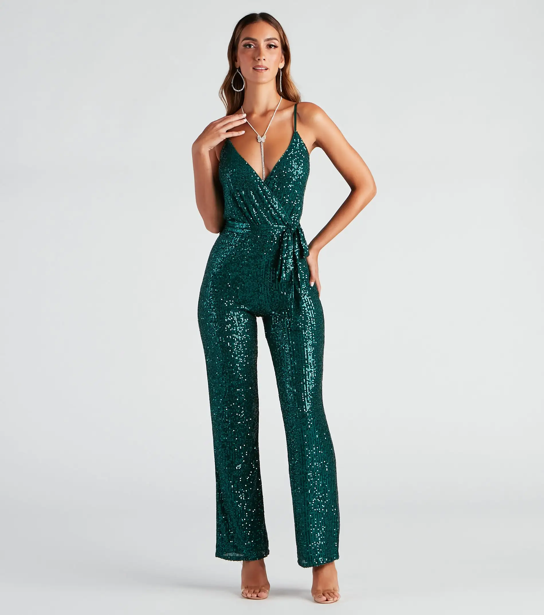 Bring the alluring glamour to your night out vibe with this sequin jumpsuit. It features a sleeveless plunging V-neckline with a wrap-front design, adjustable spaghetti straps, a fitted high waist with a tie-front accent, and a wide-leg silhouette. The lined knit fabric features all-over sequin embroidery for the prettiest shine. Style with