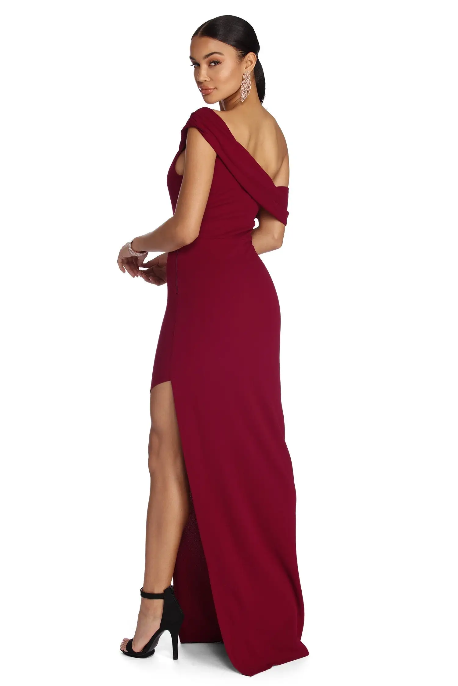 Slay your look with a little shoulder action in our Althea burgundy dress! She features an asymmetrical one shoulder neckline, a fold over accent and an elongating floor length silhouette that is accented with a high side slit. She is composed of a lined crepe fabric that offers a curve hugging fit with a moderate stretch. Includes a side zipper closure with a fish hook clasp.