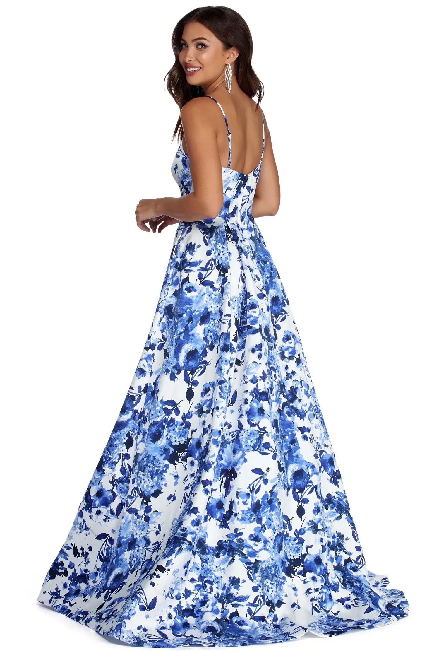 Get lost in a floral frenzy as you enchant in our Amora dress! She features a combination white with blue hue, a plunging wired V neckline, padded cups, built in boning and adjustable narrow straps. Her slim fit bodice leads to a voluminous ball gown silhouette that is accented with hidden side pockets. She is composed of a white hued satin fabric that is adorned with a blue hued printed floral pattern. Dress offers a form hugging fit with minimal stretch. Includes lining, petticoat and a back zipper closure.