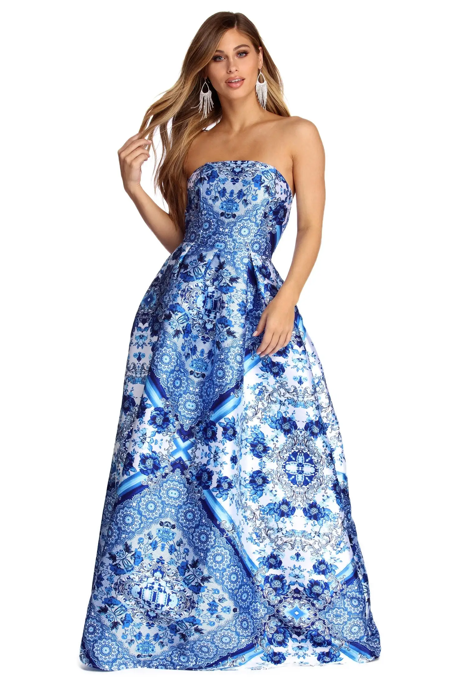 Keep it sweet and charming as you capture their heart in our Ari dress! She features a combination white with blue color, a straight strapless neckline, a built in no slip strip, padded cups and built in boning for support. Her slim fit bodice leads to a voluminous ball gown silhouette accented with hidden side pockets and petticoat. Her all over bohemian-inspired print features floral, medallion and paisley designs. Dress is composed of a lined textured satin fabric that offers minimal stretch. Includes a back zipper closure.