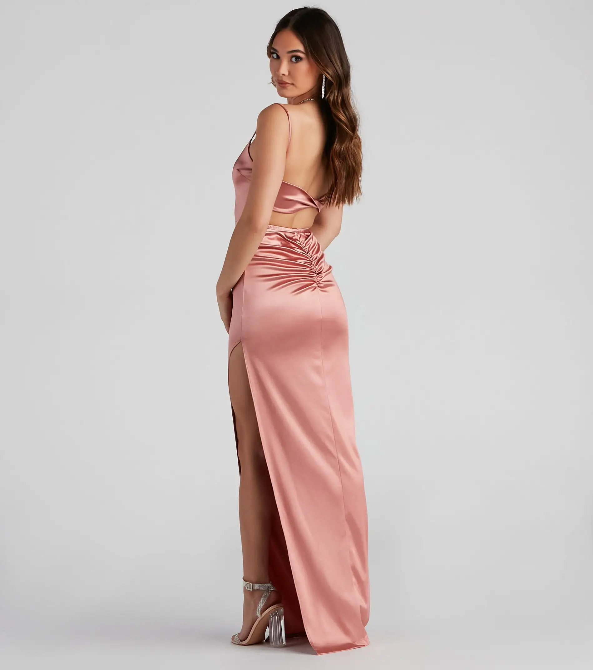 Achieve a sleek and chic look that brings subtle sultry vibes with the Ayla satin dress! She features a sleeveless square neckline, spaghetti straps, a high waist seam, an open back with a trendy twisted strap design, lower back ruching, and a floor-length fitted silhouette with a thigh-high side slit to showcase some leg. The smooth satin-knit fabric offers a moderate stretch for comfortable wear. Style this dress with