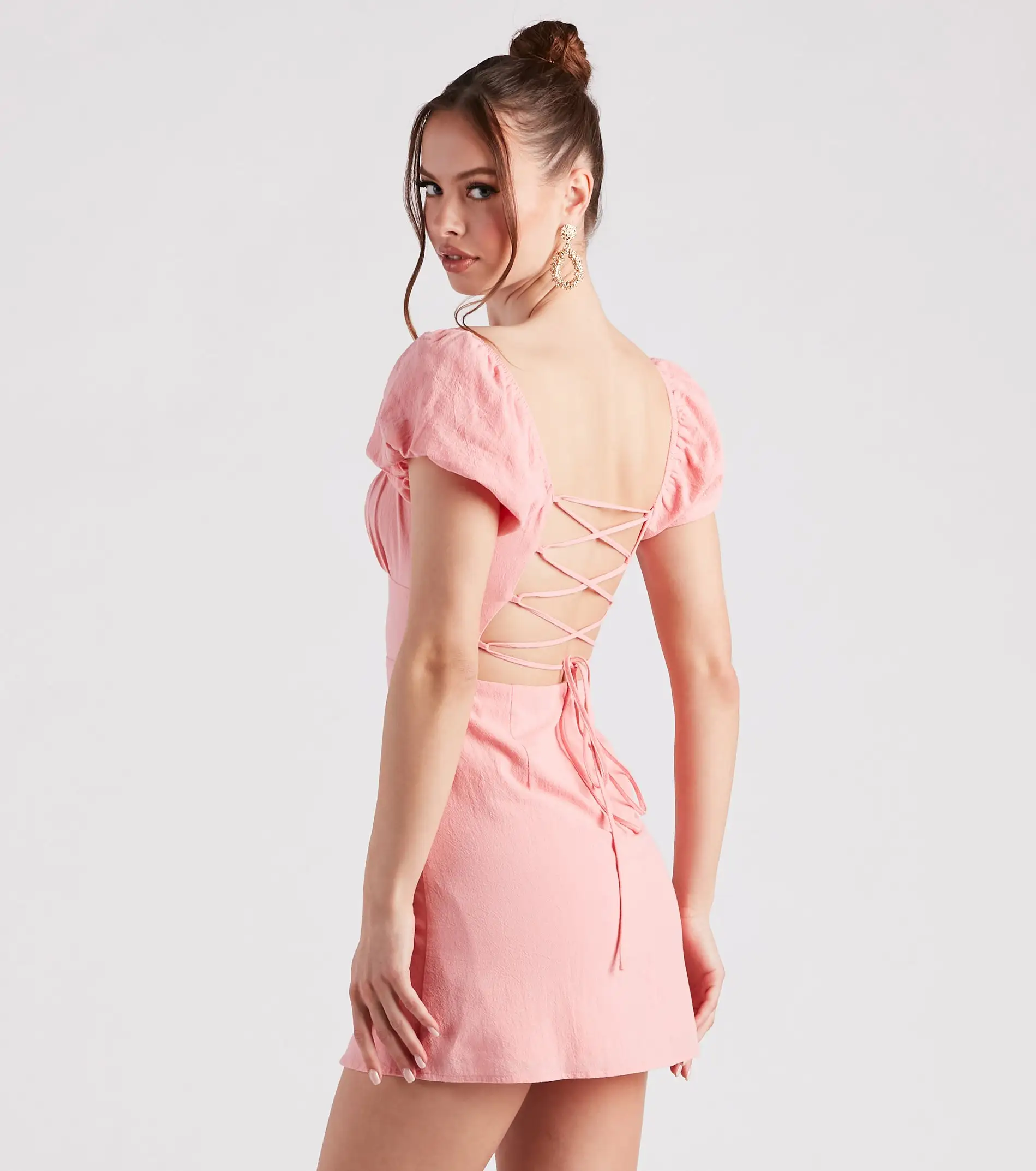 Enter looking like bae just breezed in! Capture cuteness in this linen short dress featuring short puff sleeves, a square neck, an open lace-up back, and an A-line silhouette. Style with a trendy