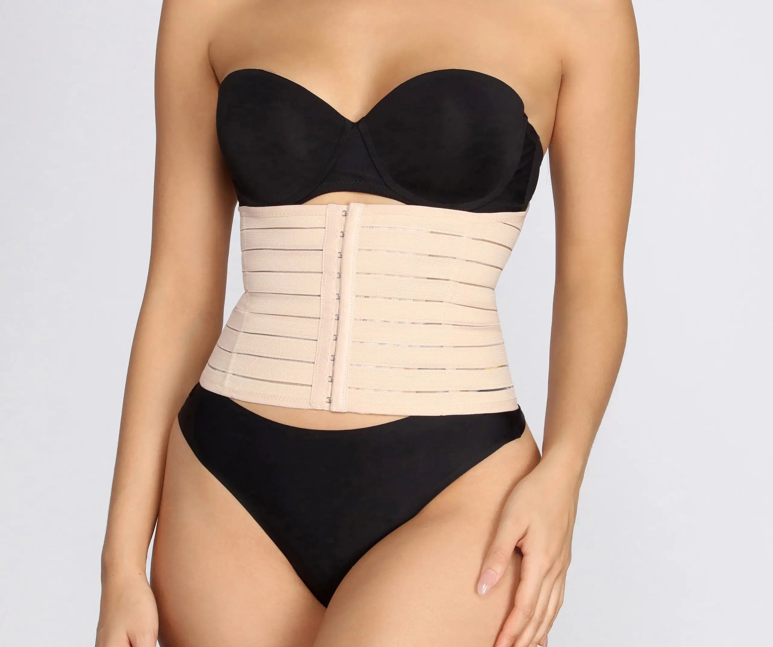Help create a minimized waistline and midriff for an hourglass shape! Featuring built in stretch, and firm control with the 10 vertical rows of hook and eye closures and 6 horizontal adjustments. Designed with wired vertical boning, and composed of a stretchy bandage material. This waist cincher helps even out and smooth your body for a more sleek and slim look!