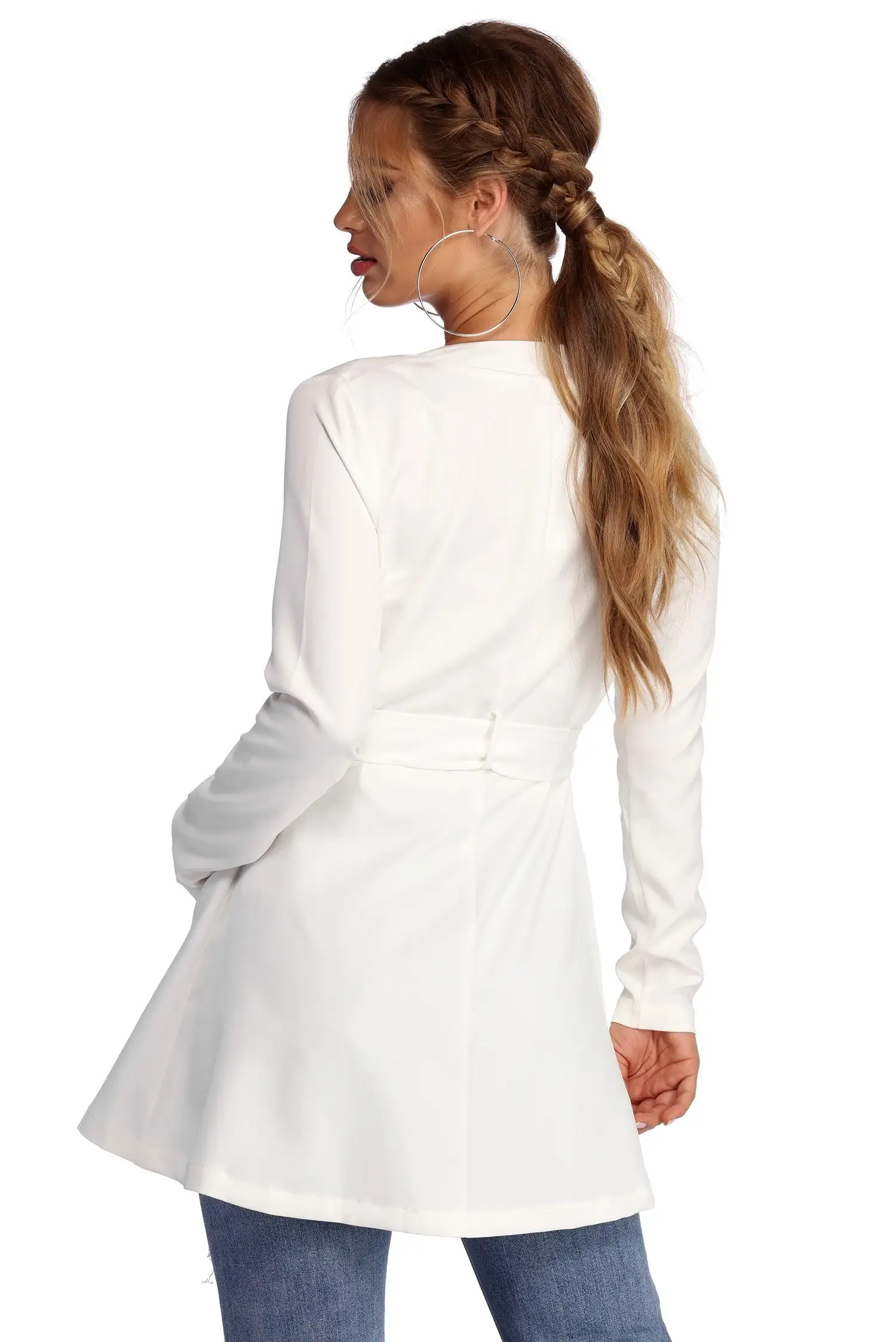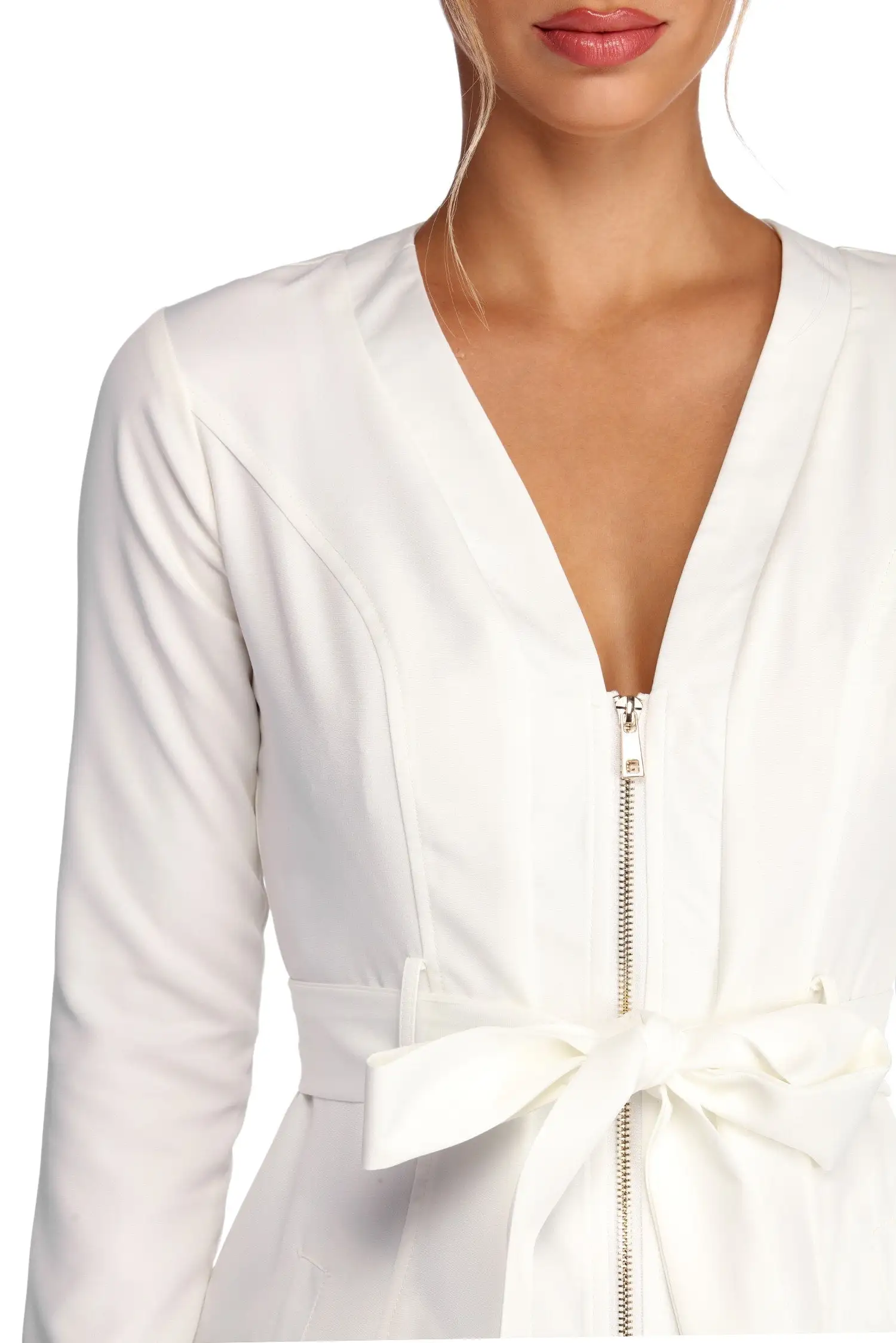 Add a layer of sophistication with this belted trench dress! This essential ivory jacket can be worn as a coat or zipped up as a dress! It features a V neckline, long fitted sleeves, a gold zip front, a tie waist belt, and slanted front pockets. The trench is composed of a woven fabric with no stretch.