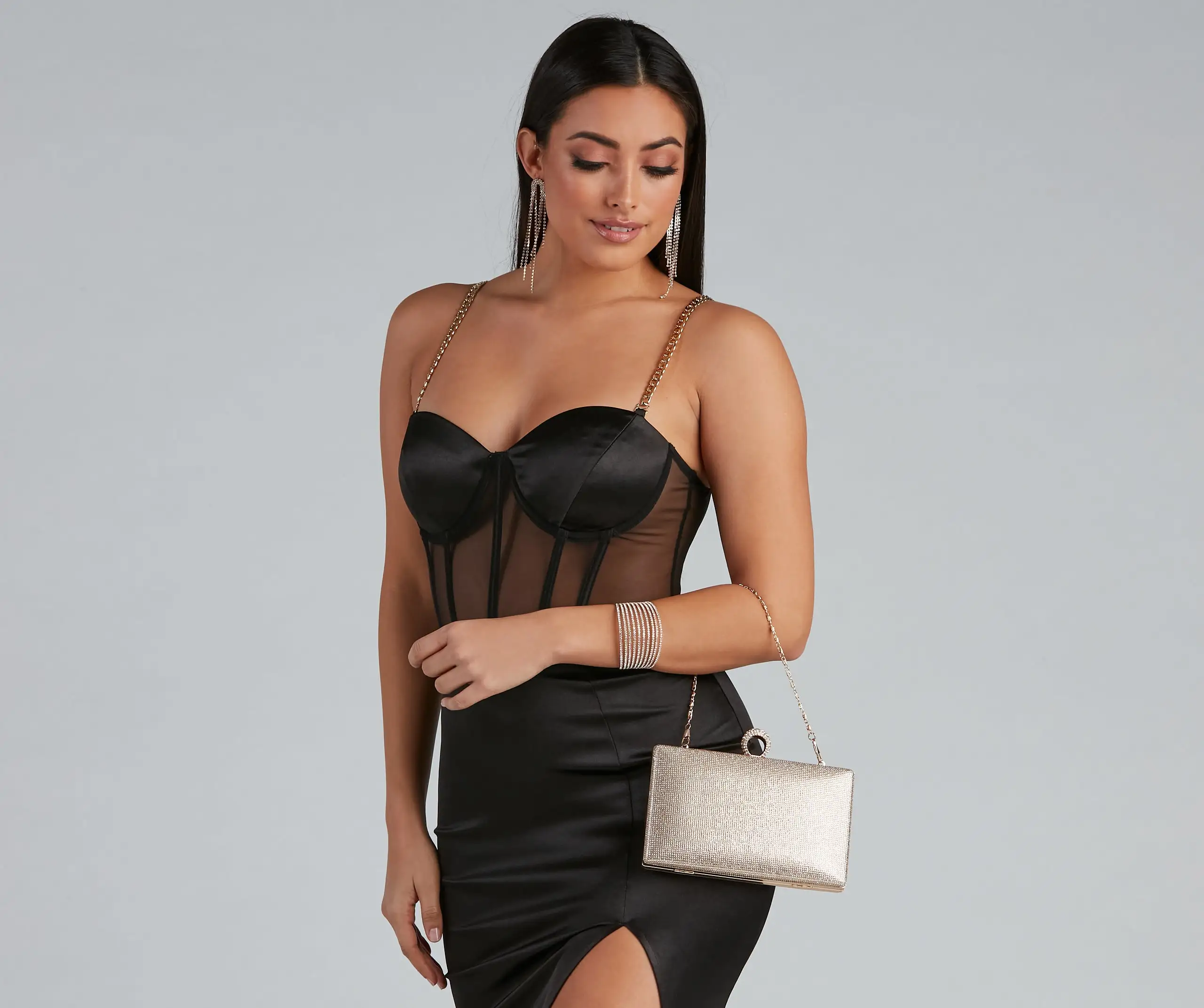 Your outfit could use some bling! This rhinestone box clutch features a top ring closure, detachable chain-link strap, and a metallic sparkle exterior. Complete the look with a chic satin