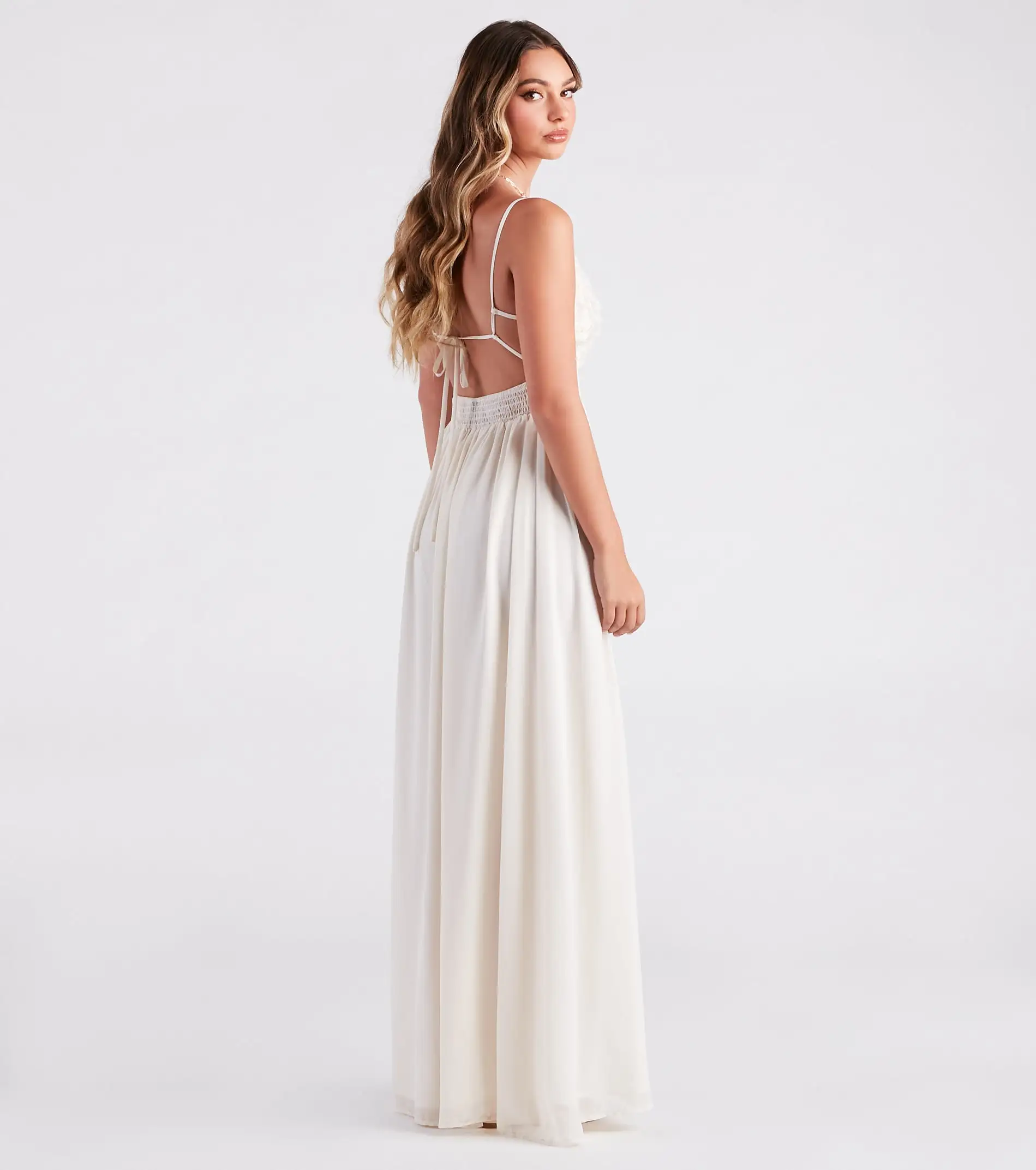 Enter every soiree looking blissfully beautiful in this chiffon maxi dress! Featuring a sleeveless V-neck with ruffle trim, adjustable spaghetti straps with a tie-back design, and a flattering babydoll-style silhouette, front slit, and maxi-length hem. Complete the look in