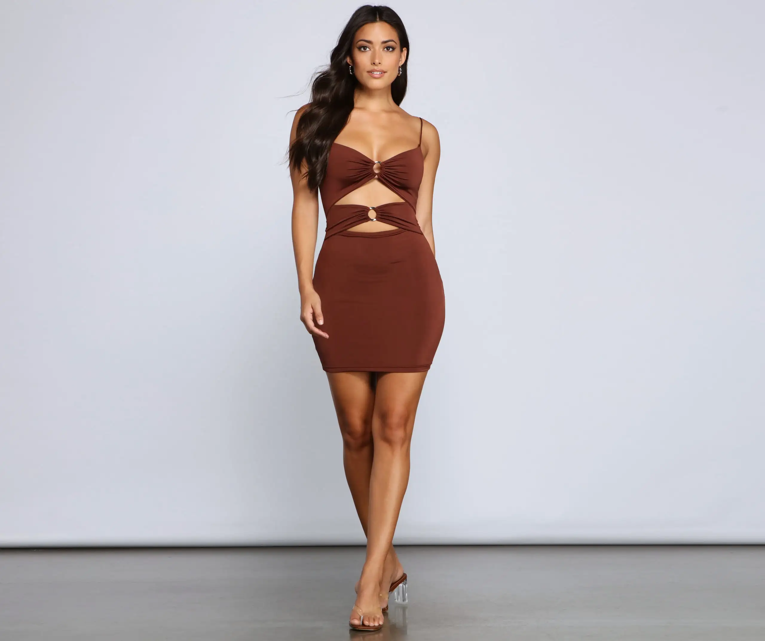 Showcase stunning looks in this bold mini dress perf for a night out. It features a sleeveless V-neckline, spaghetti straps, dual waist cutouts with O-ring accents, and a short, curve-hugging silhouette. Style this dress with sleek