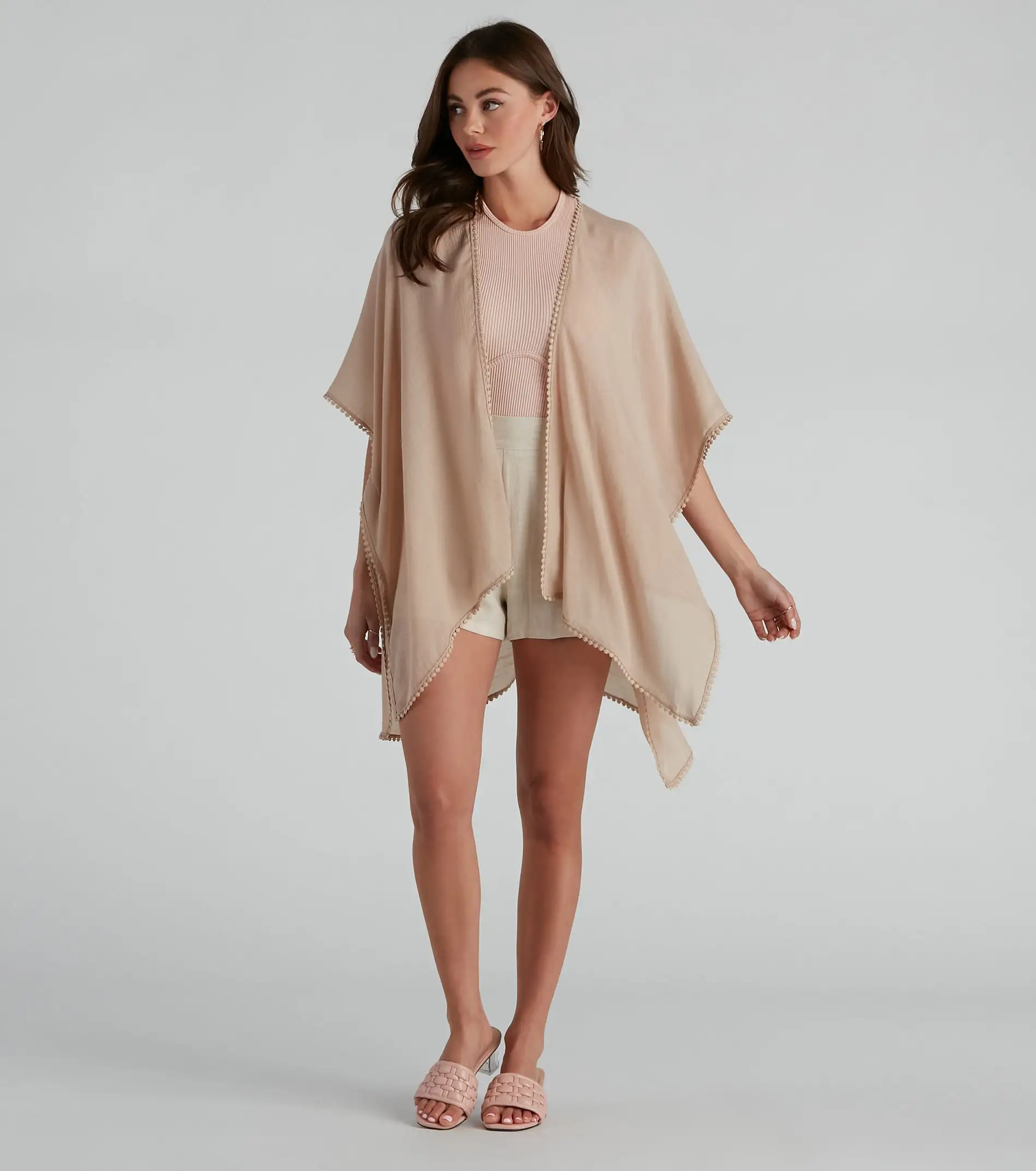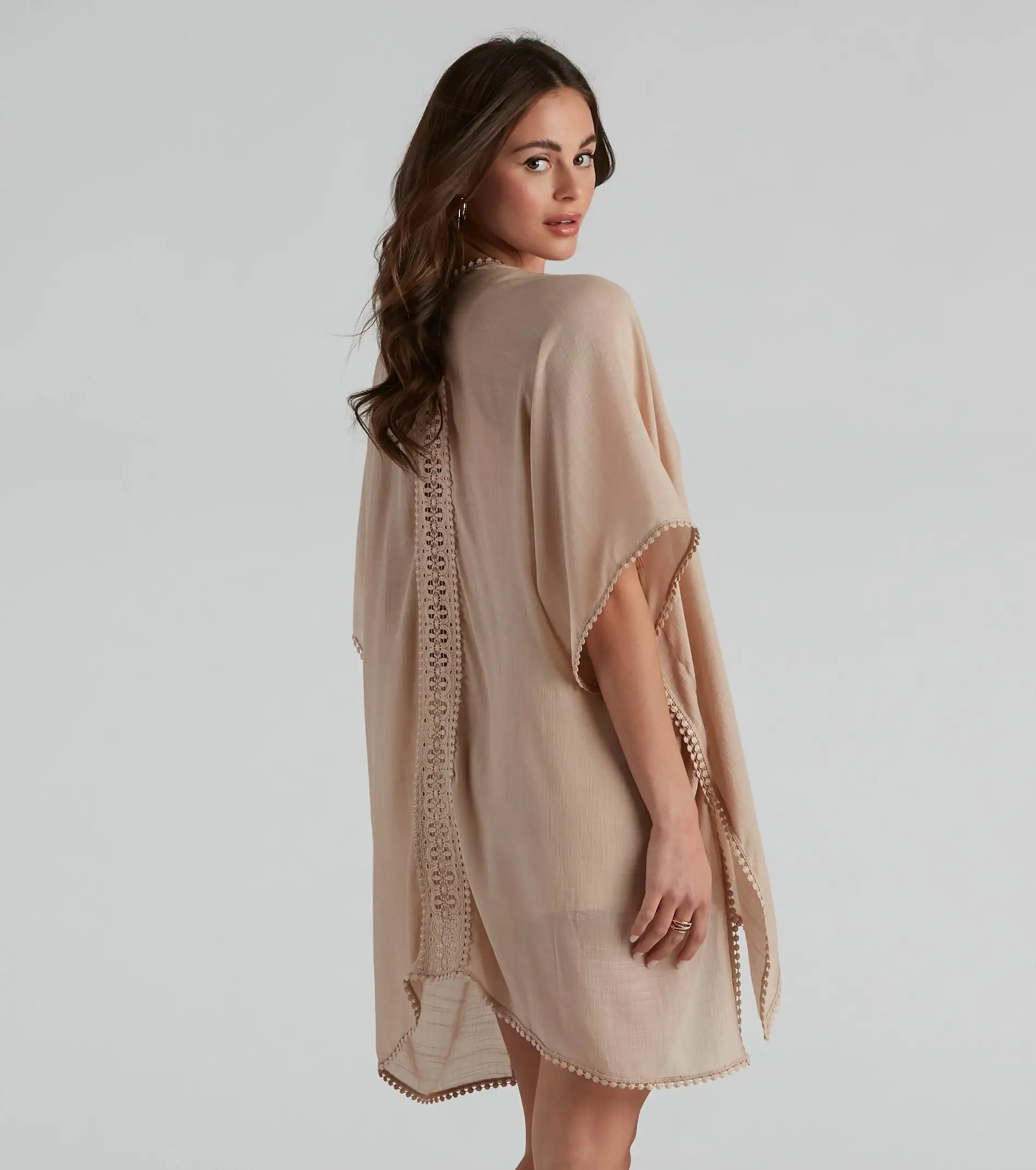 Layer on this breezy and chic kimono to elevate every outfit! It features short sleeves, an open-front design, a back crochet trim, and a flowy long hem. Complete the look in