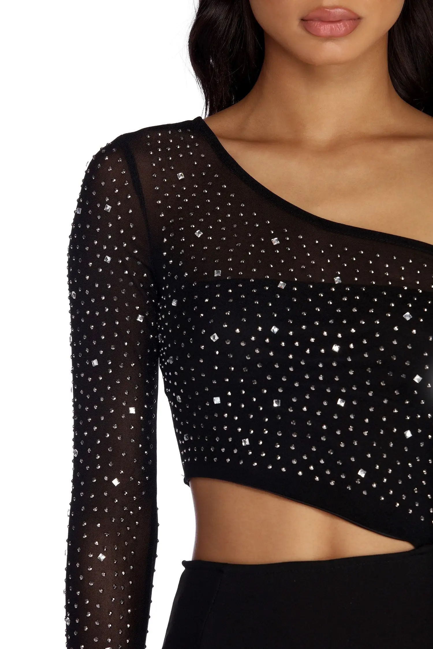 Bring the glamour as you command the room with gleaming heat stones! Bria features a black hue, a one shoulder neckline, an unlined fitted long sleeve and a interlocked knit lined bodice adorned with heat stone accents. Her waist features sexy cut outs for a pop of skin and leads to an elongating floor length silhouette with vertical seams and a godet detail with heat stone accents. Dress is composed of a combination sheer mesh and crepe fabric that offers a form hugging fit with a moderate stretch. Includes a back zipper closure. Back is unlined.