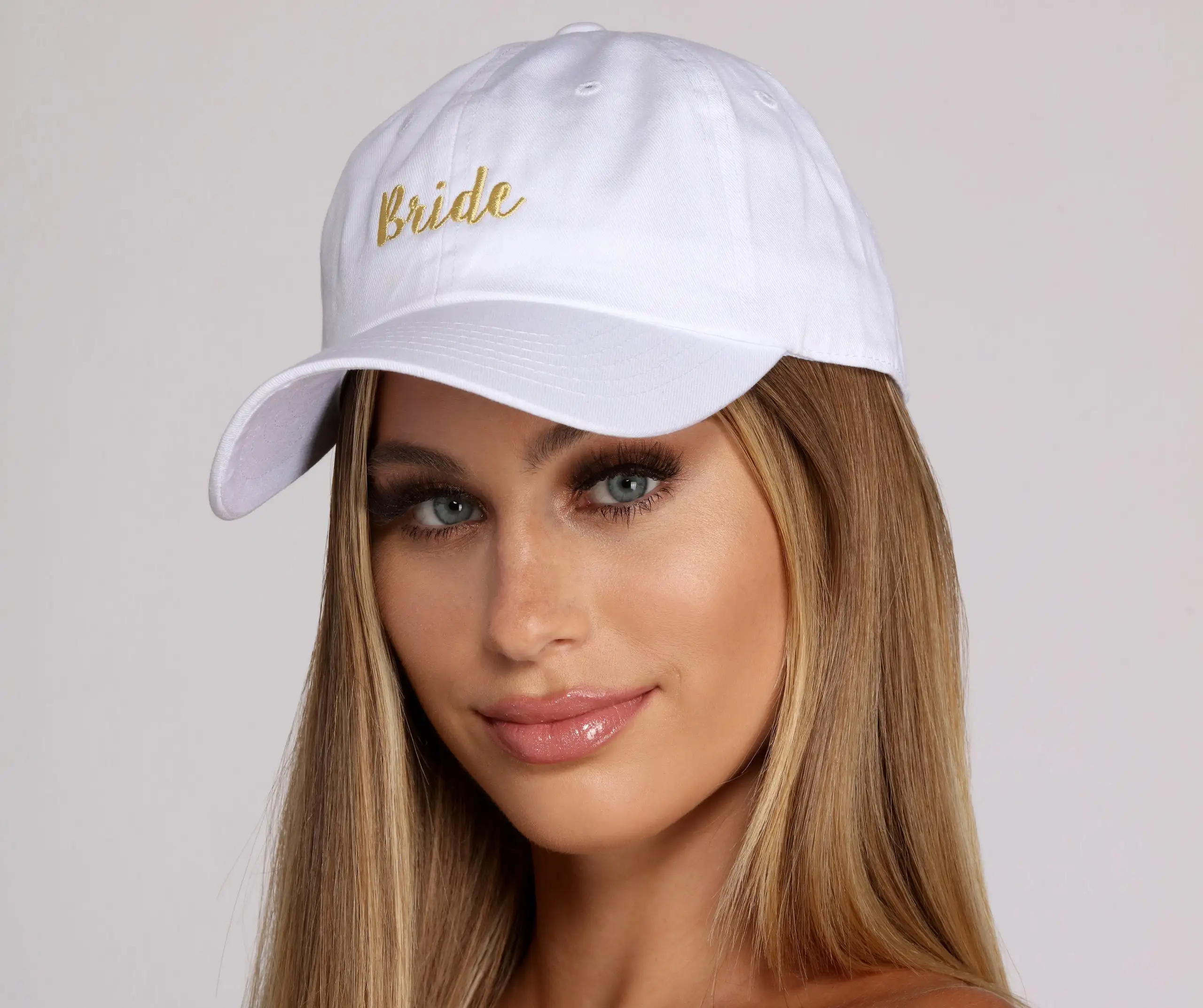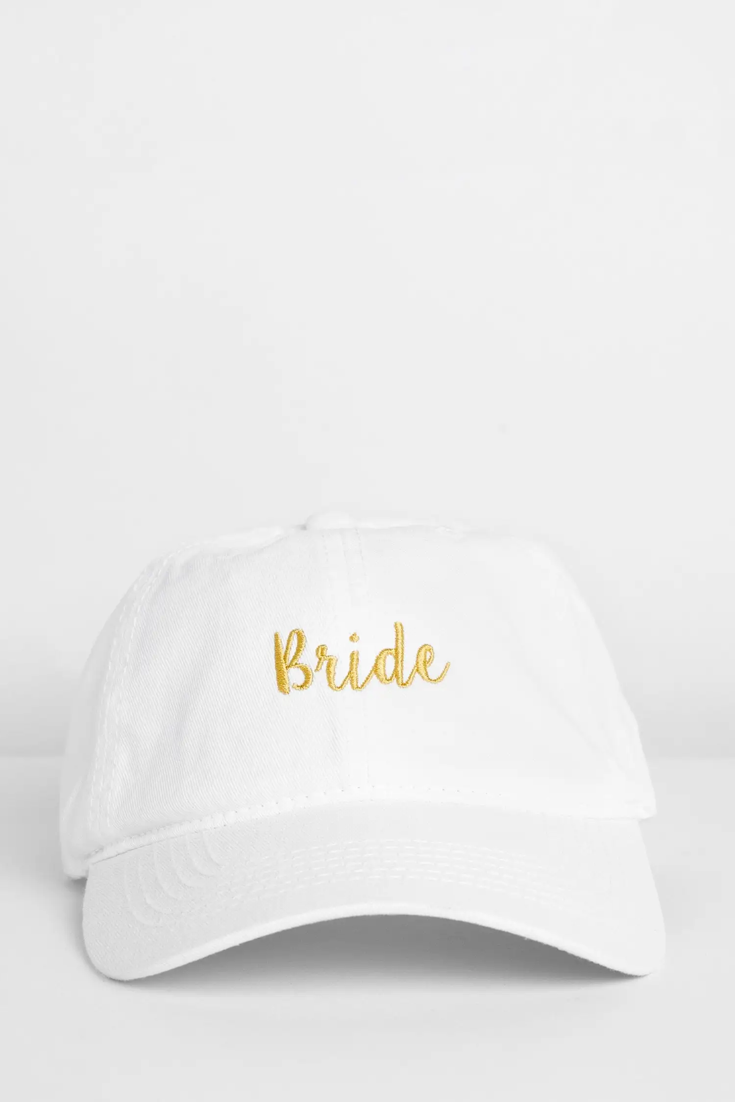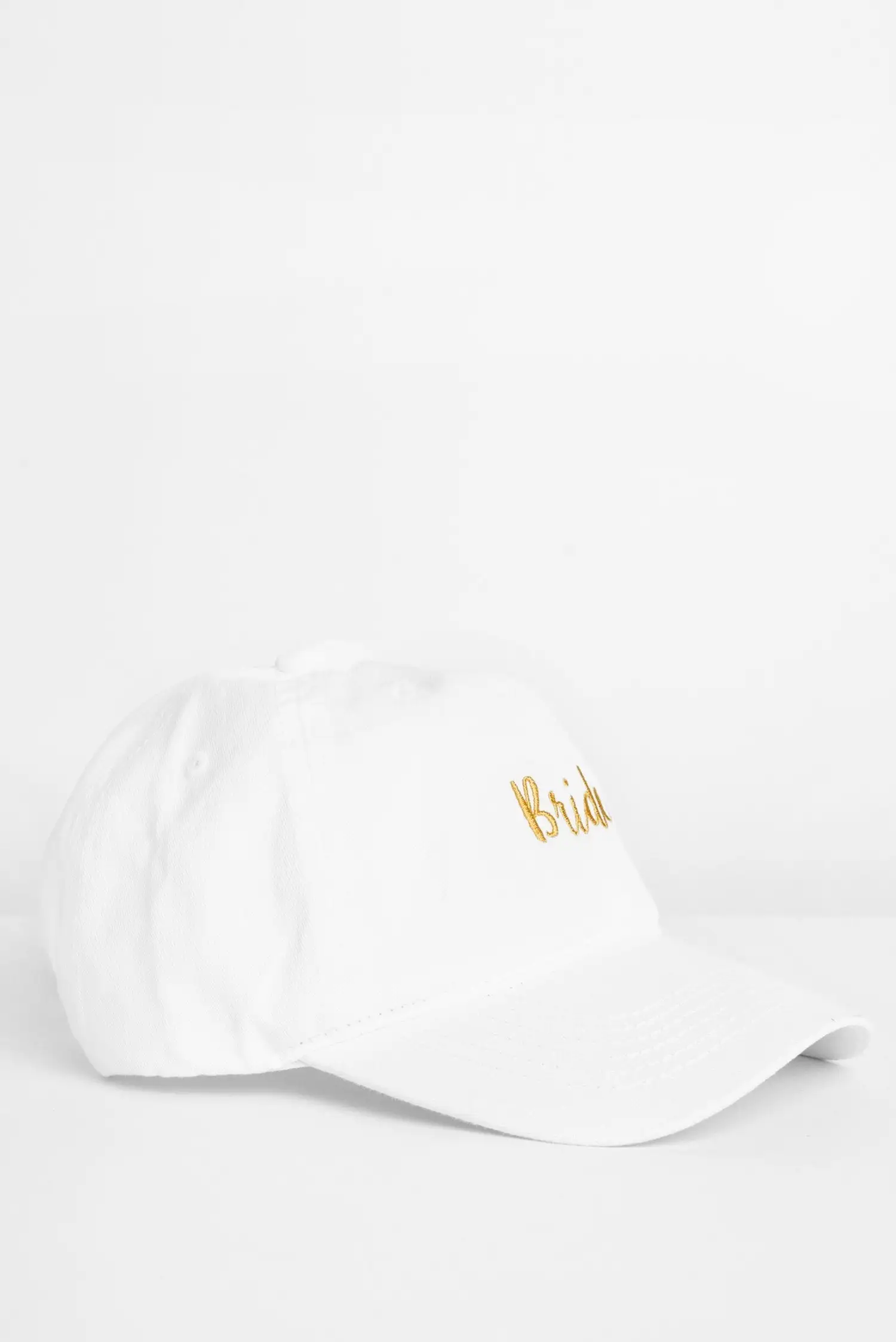 Here comes the bride! Celebrate your special moment with this cap that says it all! It features a white hue, a traditional cap design and a contrasting gold script that reads: “Bride”.