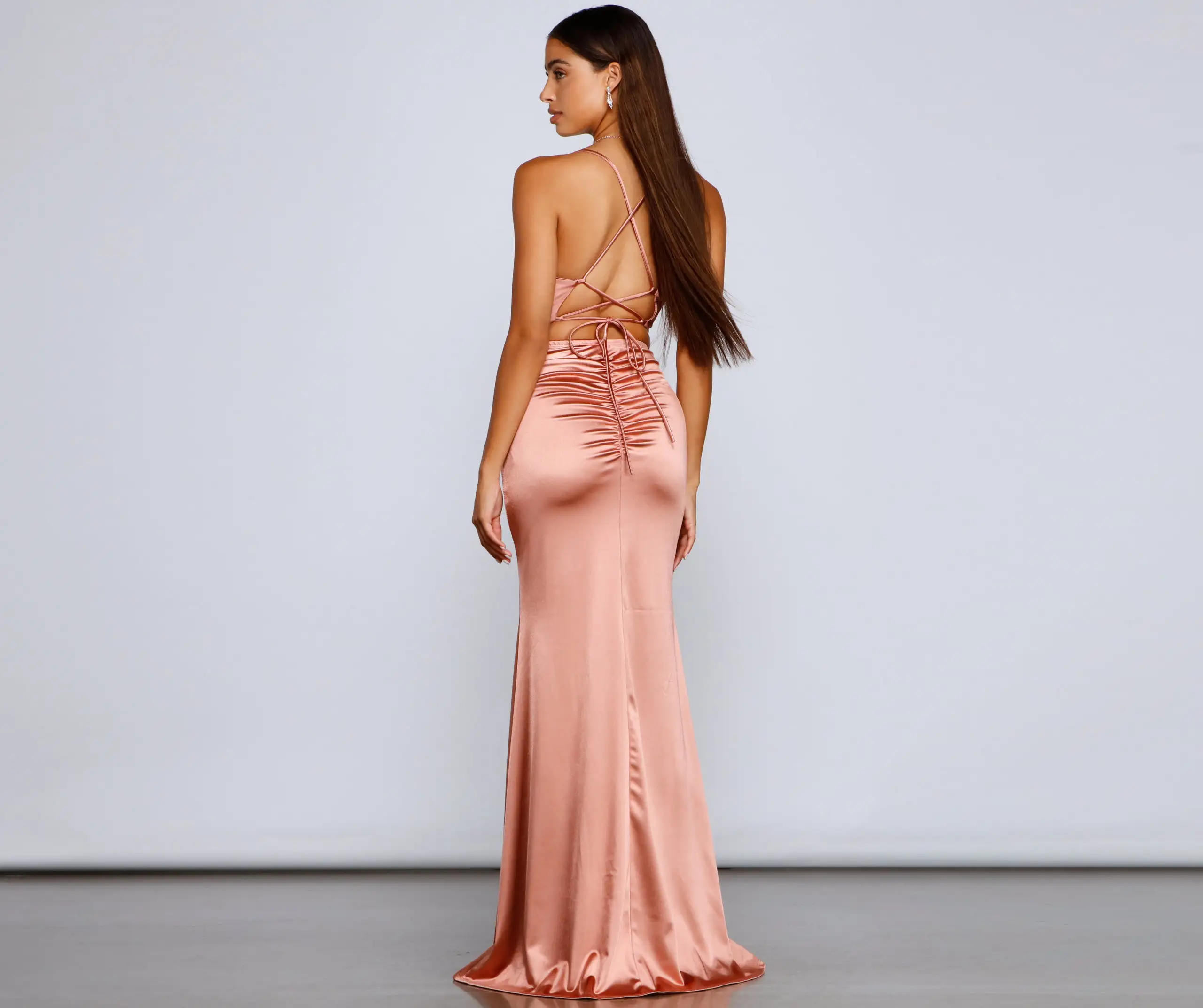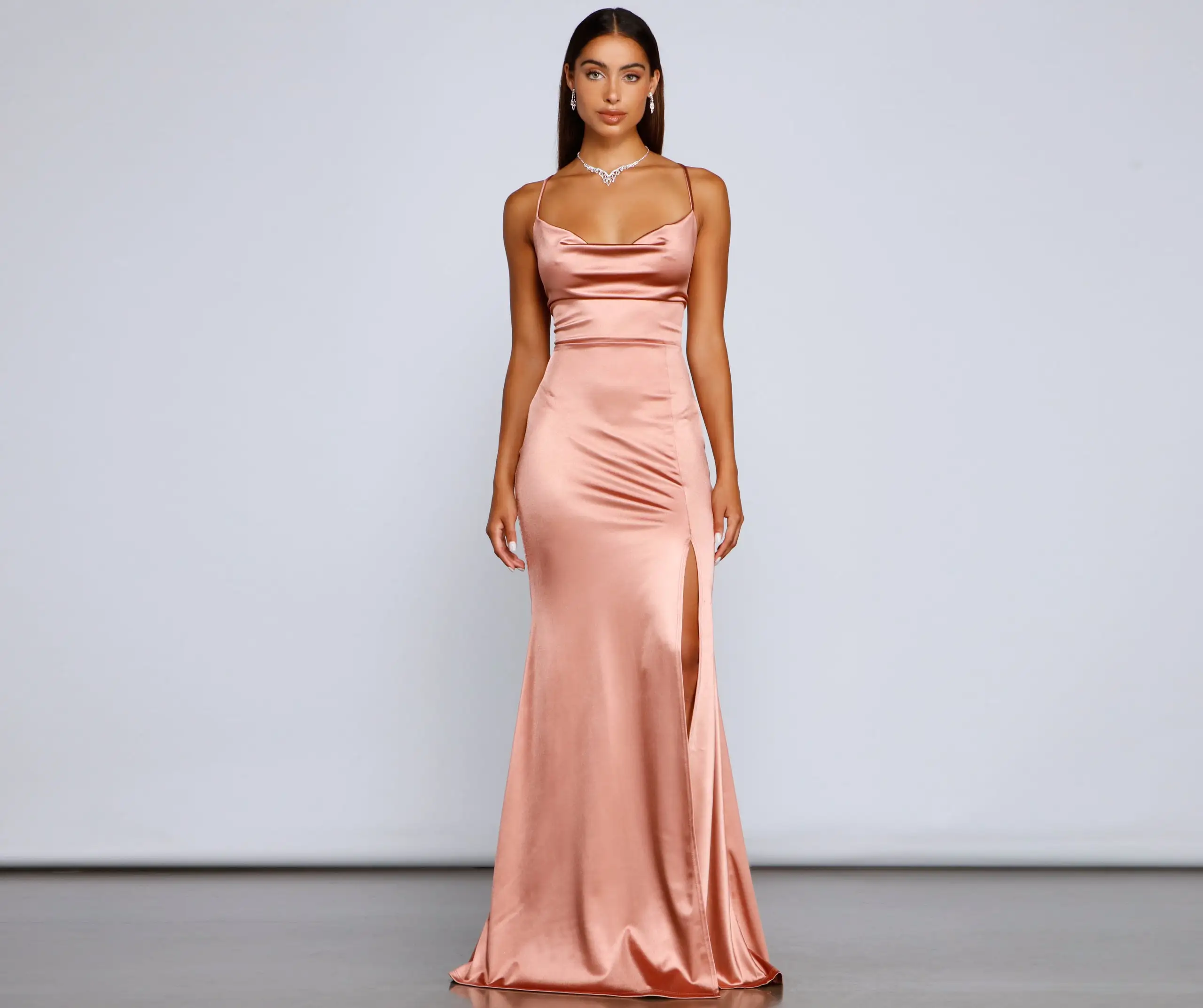 Make a head-turning entrance in a dress that brings elegance! Bristol features a sleeveless cowl neckline, spaghetti straps that lead to a cross-back design, a lace-up back that lets you adjust the fit, a mermaid silhouette, and a high side slit for a display of leg. The lower back features a ruched detail that enhances curves. The dress is composed of a satin stretch fabric that offers a form-hugging fit with a moderate stretch. Complete look with
