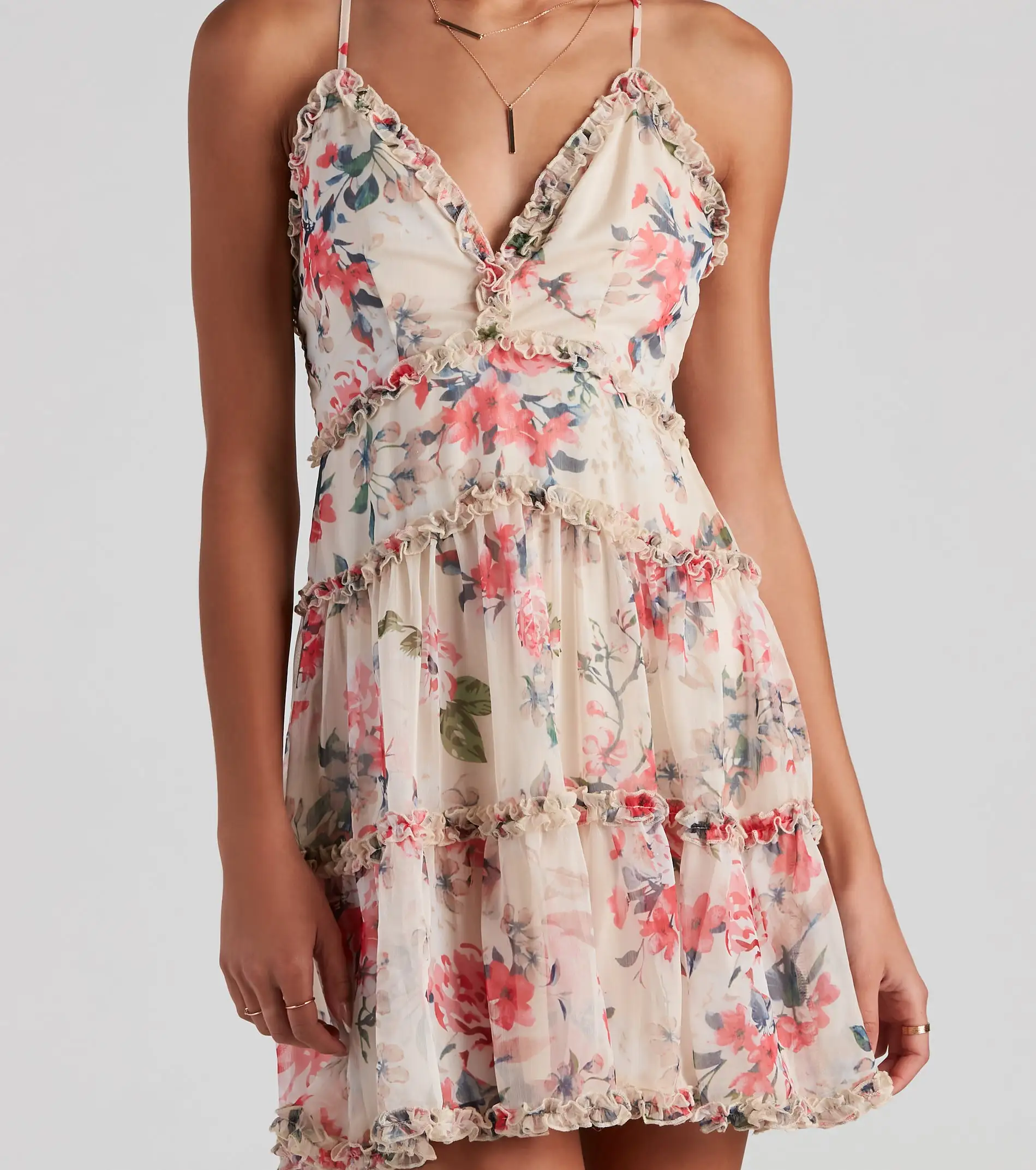 Isn’t a new romance so exciting! Enter into your new spring fling in this floral chiffon skater dress featuring a sleeveless, ruffled V-neck, adjustable spaghetti straps, an open back with cross straps, and a tiered ruffle trim skirt. Complete the look in lucite