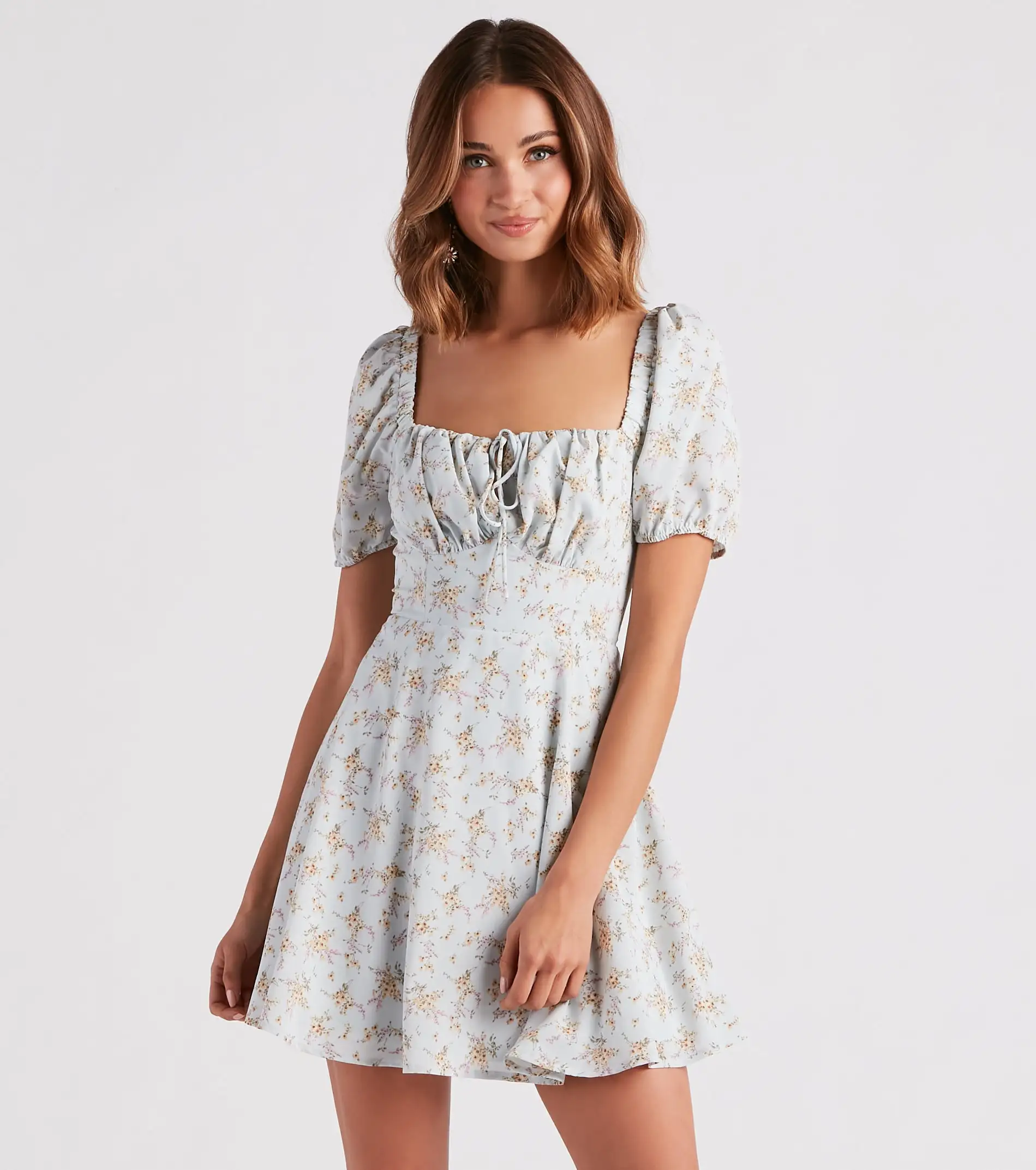 Create a dreamy spring date outfit in this adorable floral chiffon skater dress! It features a square neckline, ruching at the bust, a tie-front accent and keyhole cutout, short puff sleeves, a high waist seam, and a short skater skirt with a fit and flare silhouette. The airy chiffon fabric features an all-over dainty floral print pattern for the prettiest look. Style with