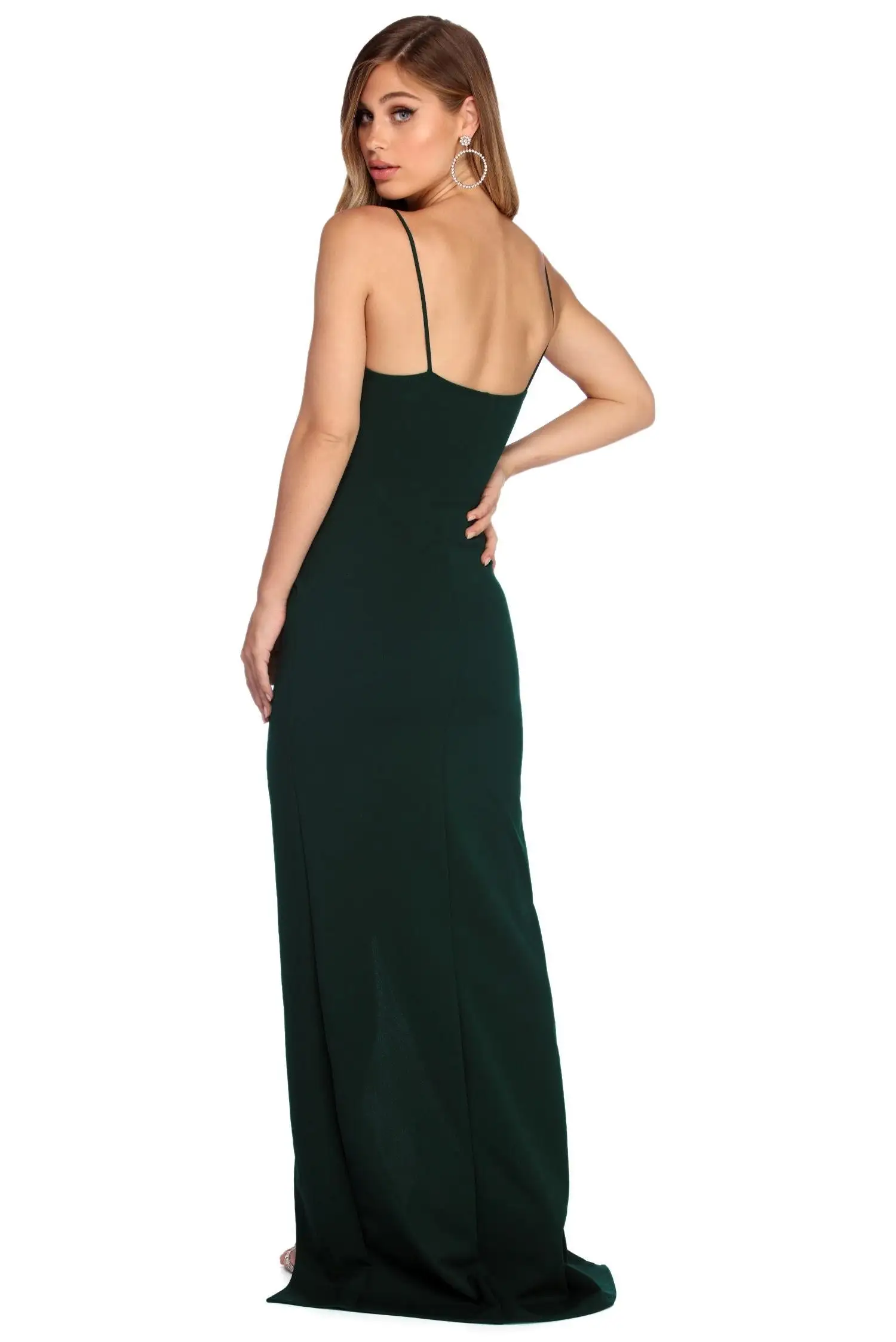 Wrap yourself in elegance as you wow in the timelessly classic Caris dress! She features a hunter green hue, a sleeveless bodice, a plunging V neckline, narrow shoulder straps, a ruched side seam and an asymmetrical floor length wrap skirt. Dress is composed of crepe fabric that offers a form hugging fit with a moderate stretch.