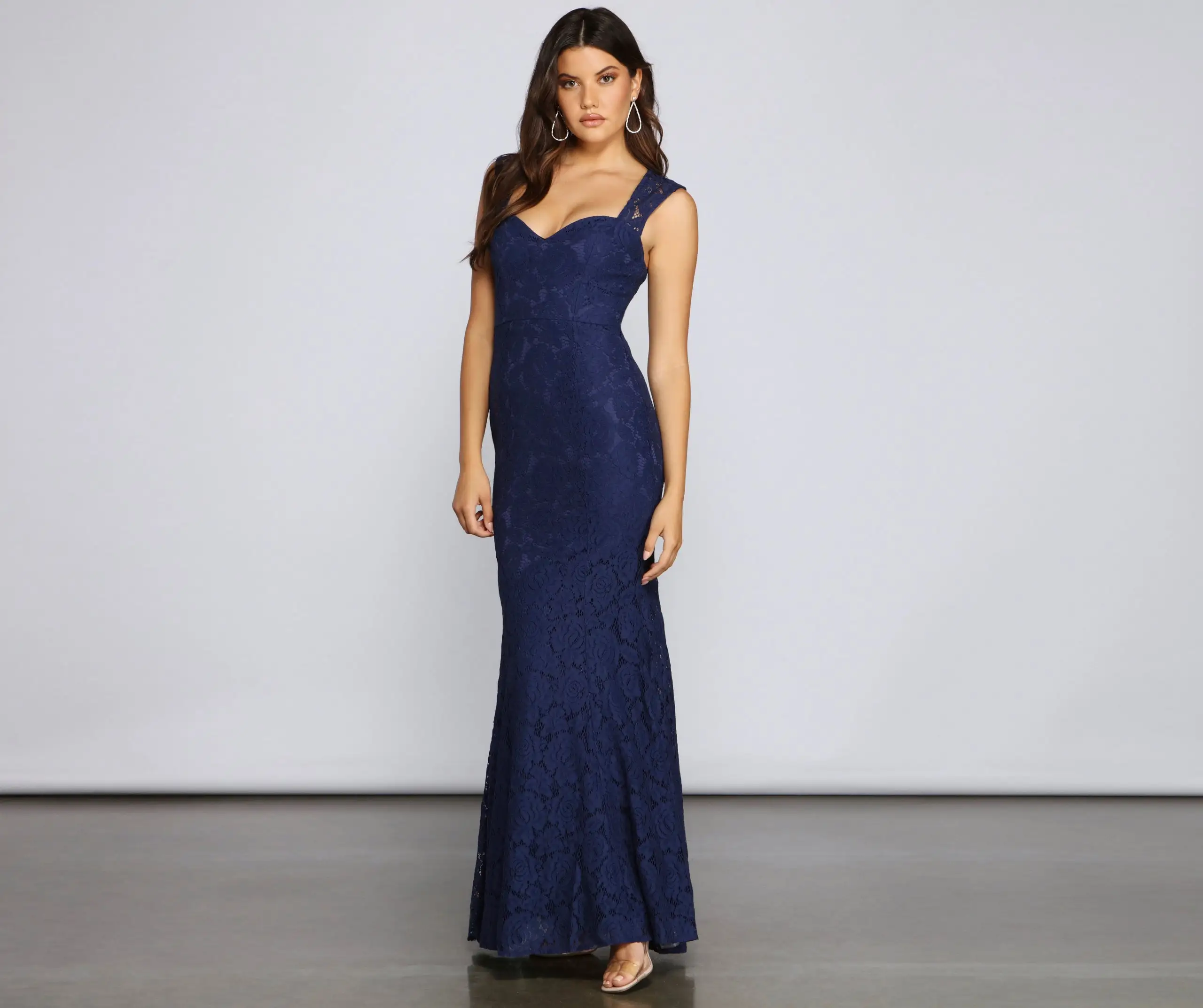 Showcase a gorgeous elegant vibe in the stunning Caroline lace mermaid dress. She features a flattering sweetheart neckline, sheer lace shoulder straps that lead to an open back design, a high waist seam, and a floor-length form-hugging mermaid silhouette. Style this dress with rhinestone earrings and a chic