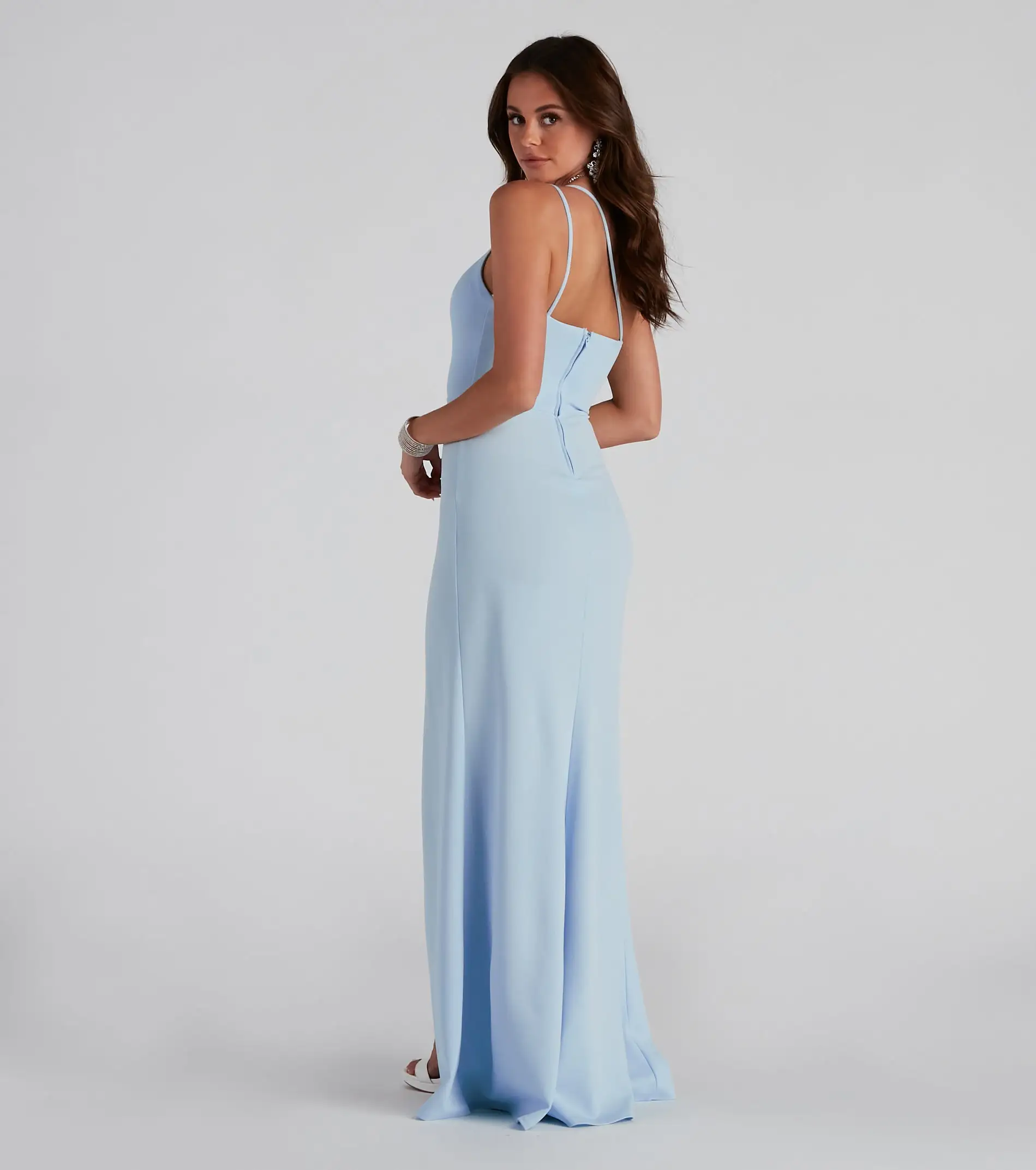 So effortless, the Caroline formal dress is simple yet stylishly chic. She features a sleeveless one-shoulder neckline with pleated detailing and a dual spaghetti strap design, a fitted bodice, a high waist seam, and a floor-length silhouette with a high side slit. Style this dress with sparkling statement earrings and an