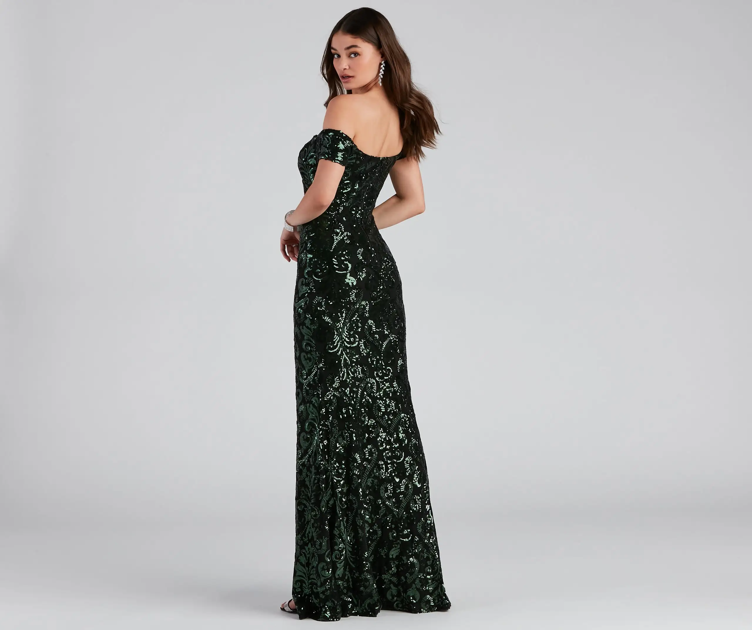 It’s your time to shine in the Carter A-line formal dress for your special prom night. She features an off-the-shoulder, cuff sleeve neckline with a non-slip grip and a center-notch accent. Her shimmering sequin scroll pattern catches the light showing off her form-fitting silhouette with a sexy high-cut slit. The lined mesh fabric gently kisses the floor along the flowy hem. Complete the look with a
