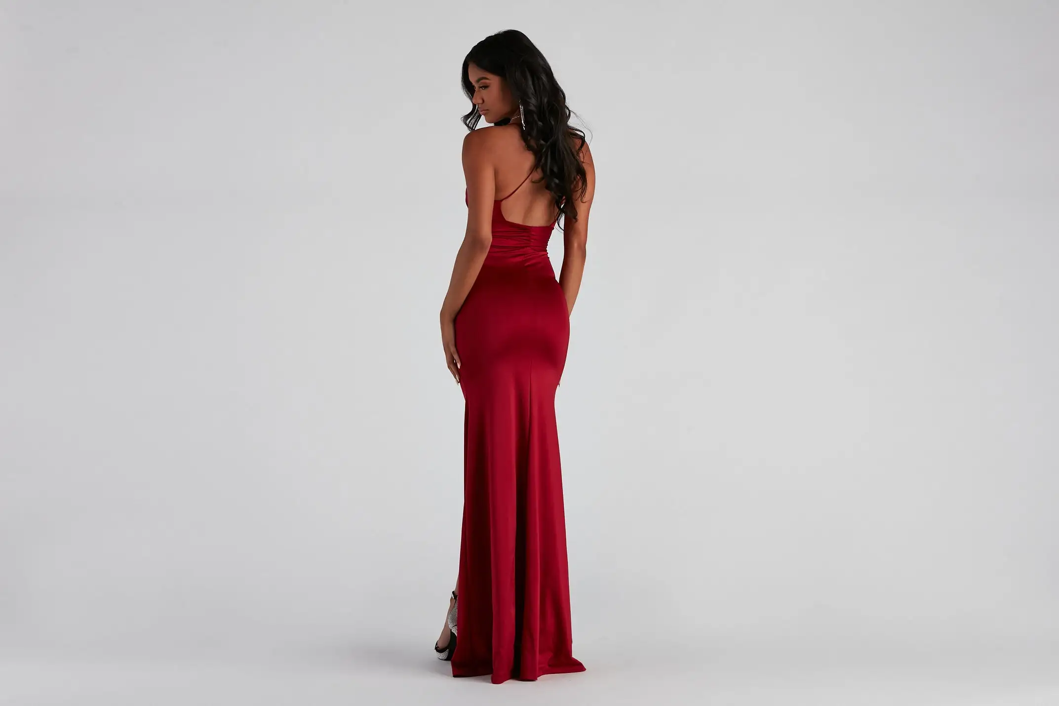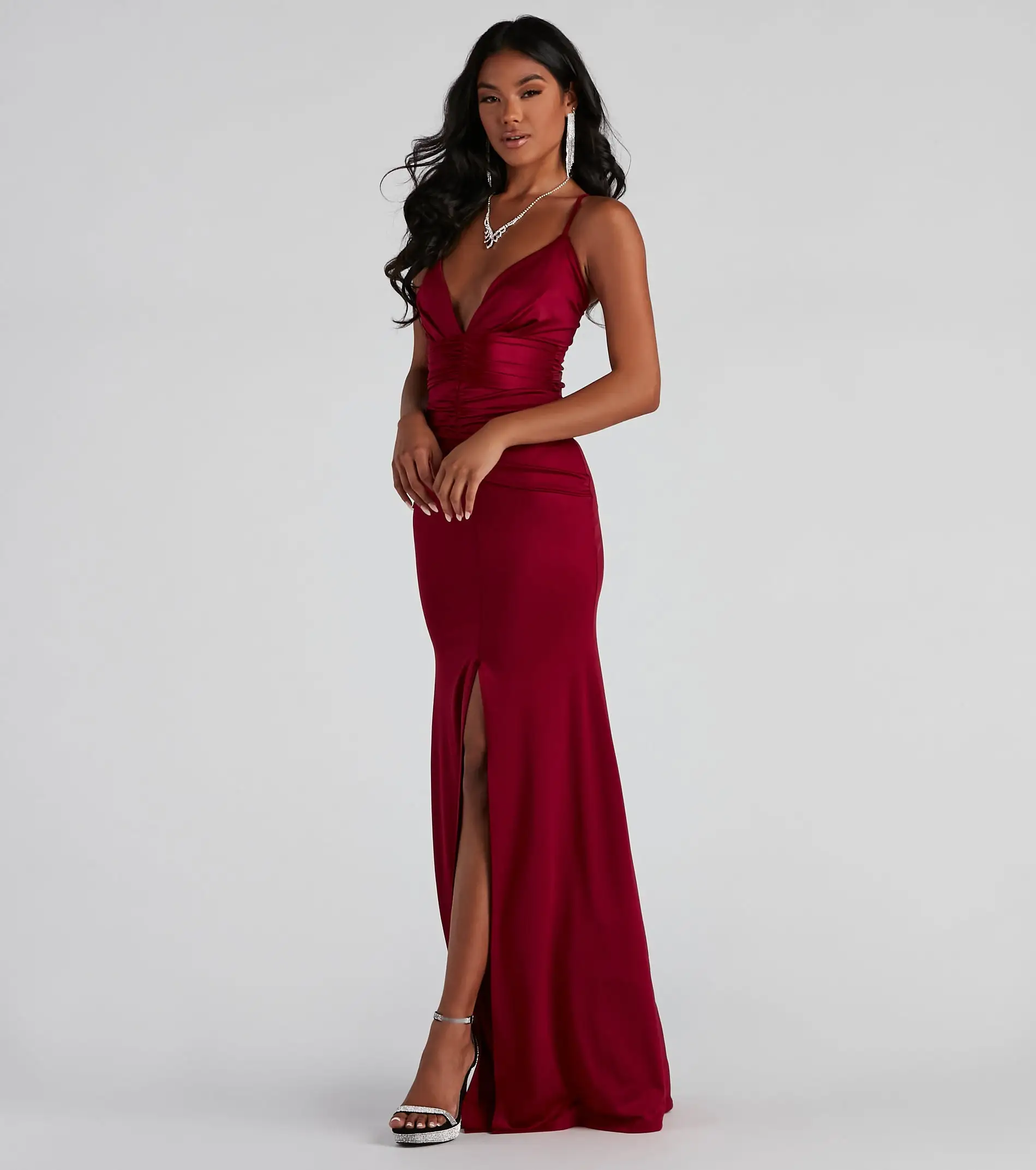 Radiate the room in the Celine formal satin dress sure to have all eyes on you! She features a sultry, sleeveless, v-neckline, spaghetti straps, and a ruched overlay bodice that leads to her open-back design with cross strap accents. Flaunt your femme figure on her bodycon silhouette with a center front slit perfect for showcasing some leg on the floor-length hem. The formal dress is composed of a luxe satin-lined fabric with a moderate stretch. Finish the look with fringe rhinestone