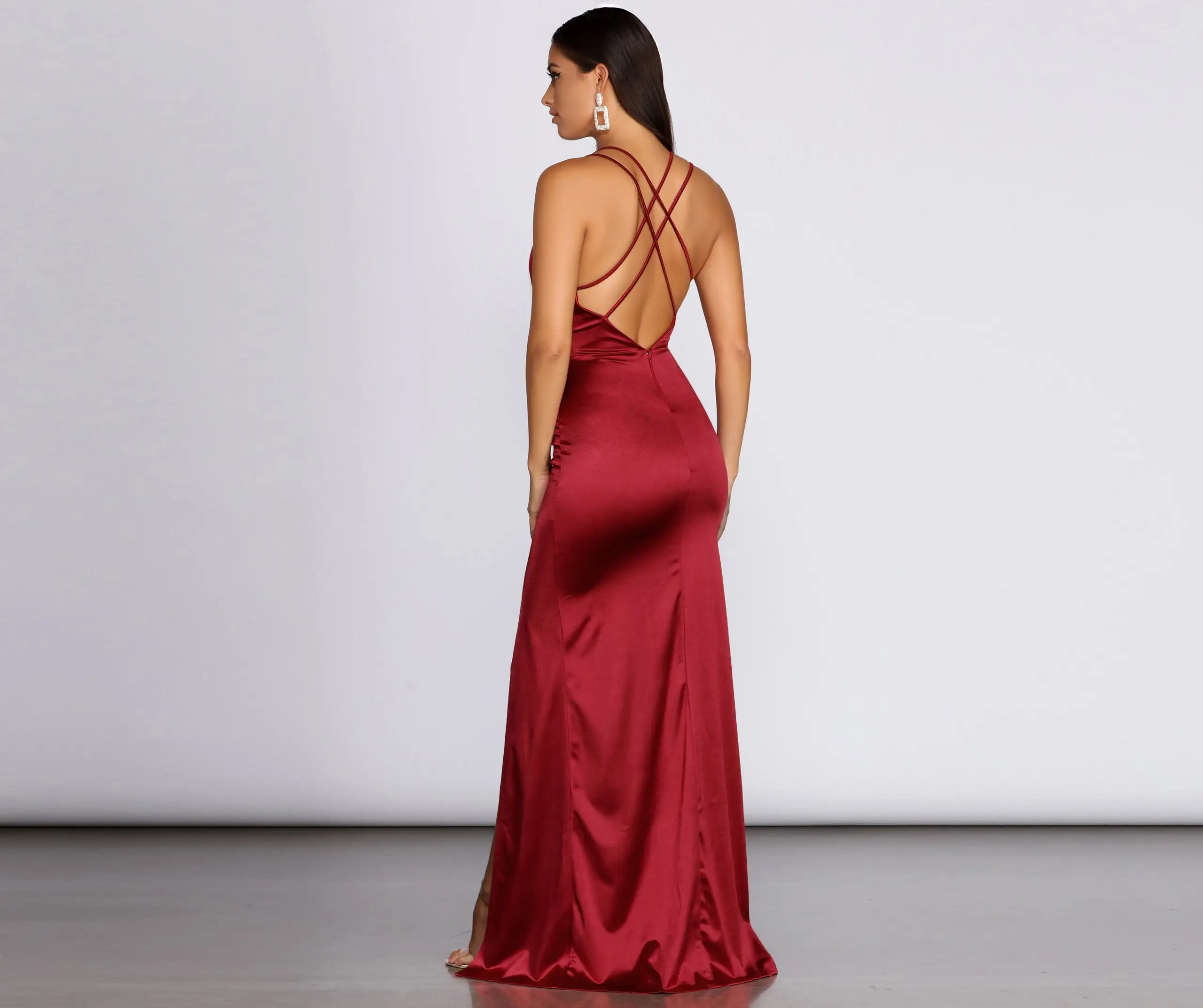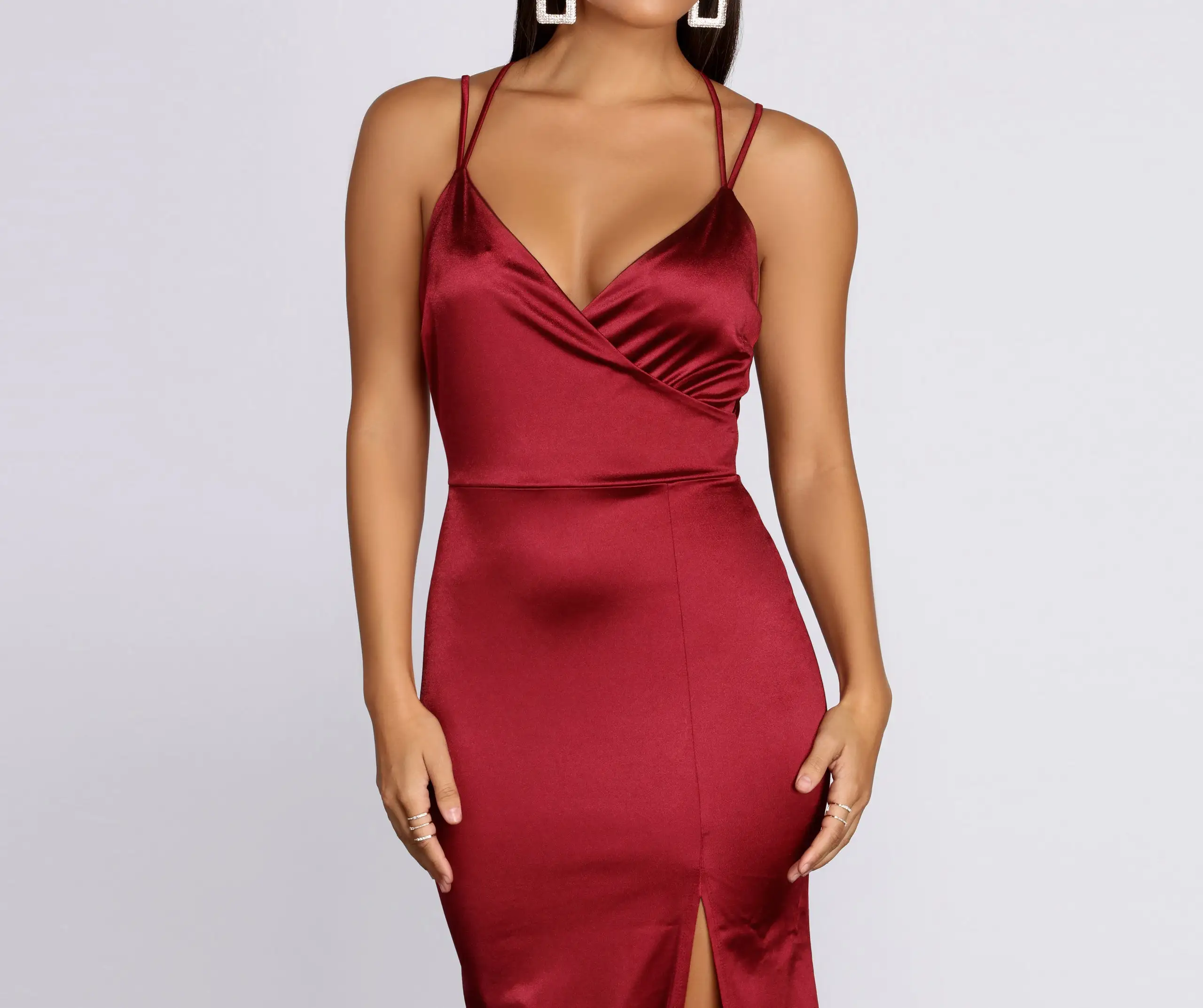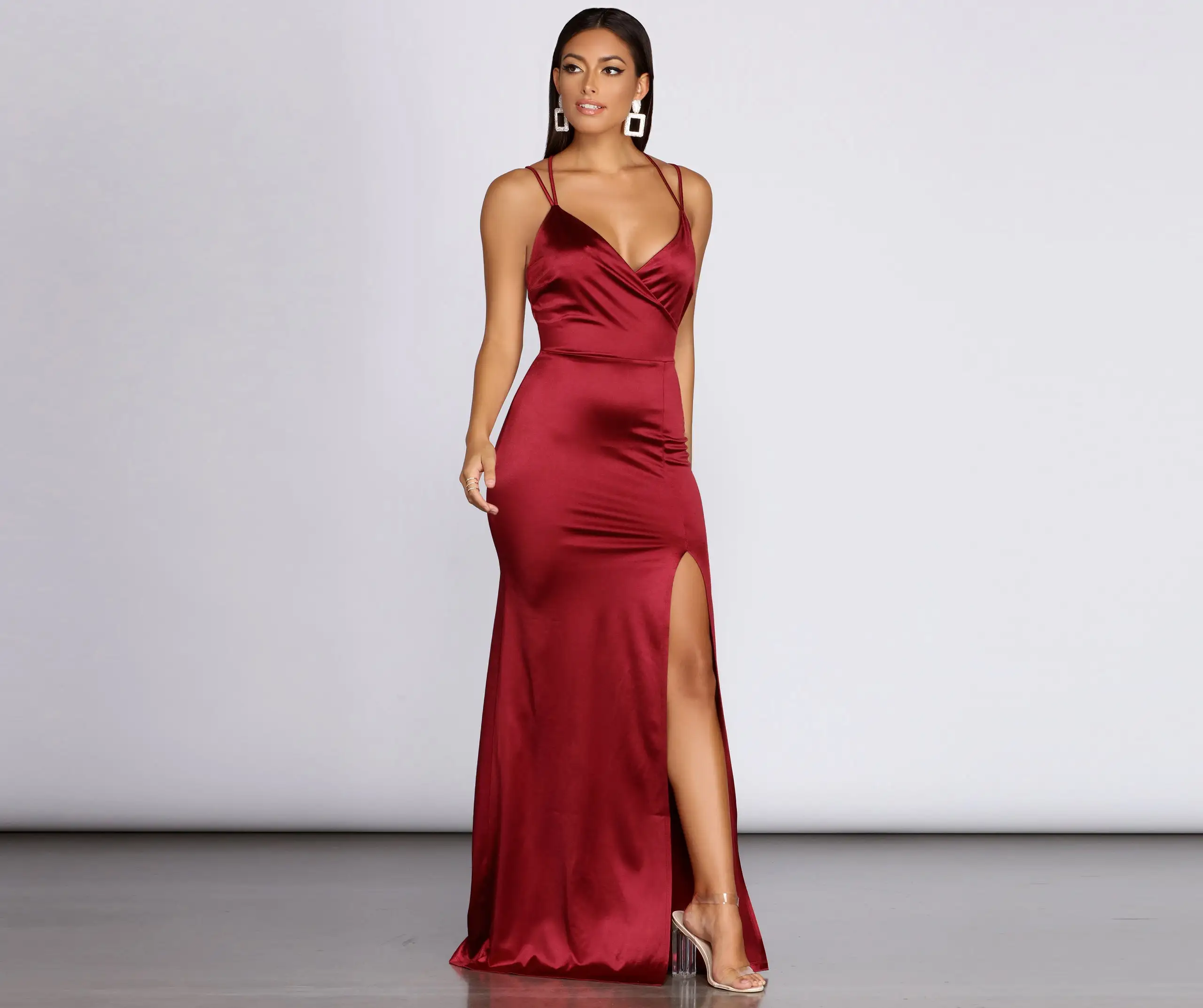 Slay like the absolute queen you are in our stunning Chelsea satin high slit dress! She features a sleeveless bodice, double spaghetti straps that lead to a cross back, a wrap front creating a V neckline, and a lower back zipper closure. Her high waist leads to a floor length skirt with a sultry thigh high slit. The dress is composed of a smooth satin-like fabric with minimal stretch.