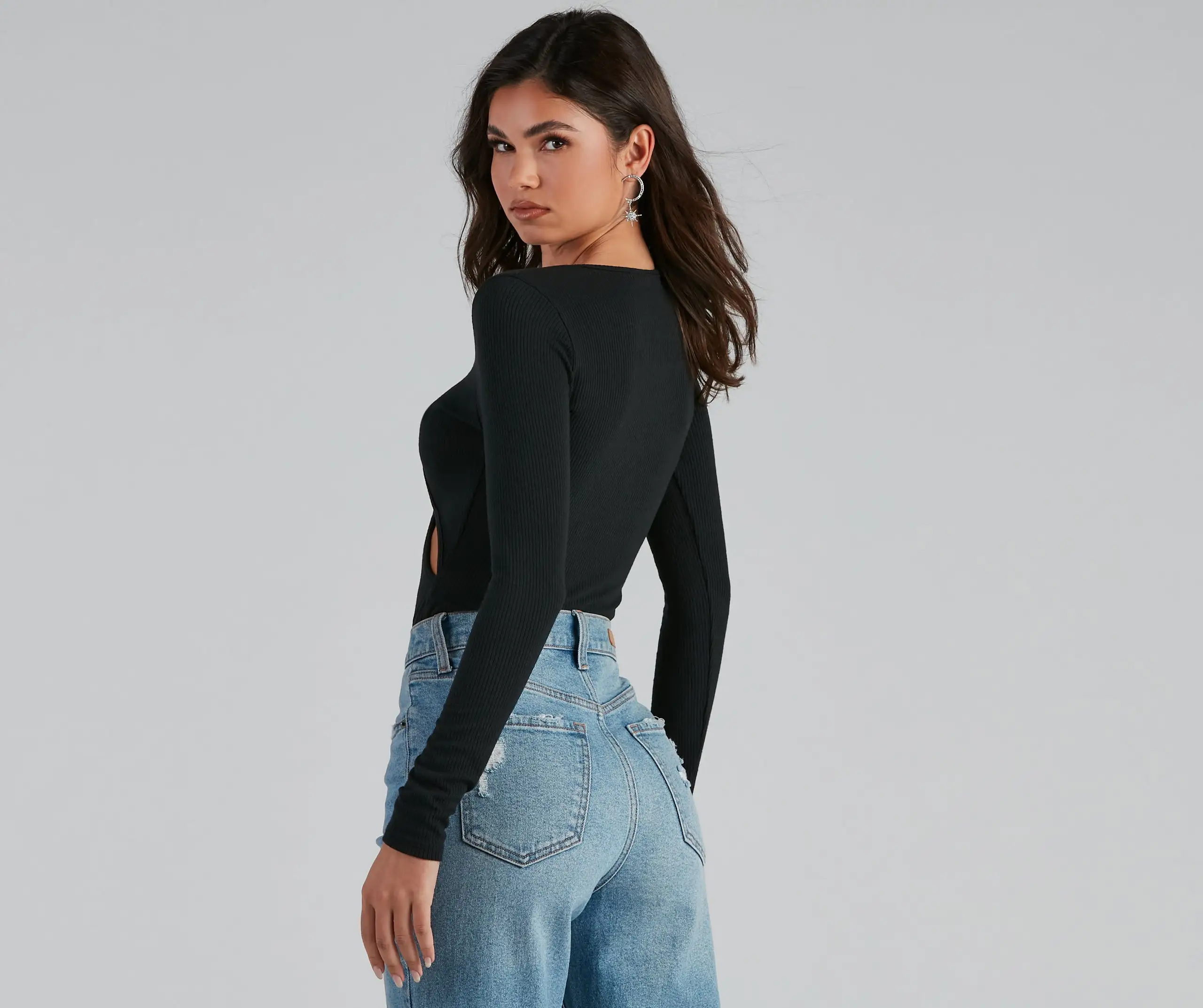 Elevate your look in this sultry bodysuit for any daytime outing. It features long sleeves, a crew neck, front keyhole cutouts, and a dual snap closure on the thong cut bottom. Complete the look in trendy