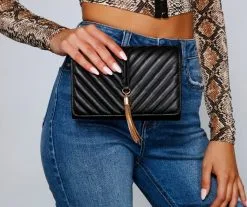 Stun on em’ with a classically chic clutch! The clutch features a small rectangular body, a fold-over closure with a snap button closure, a chain-link tassel accent, and a quilted chevron design. The interior features nylon-lining, a small zippered pocket, and multiple card slots. The exterior is composed of a faux leather material. Complete look with a