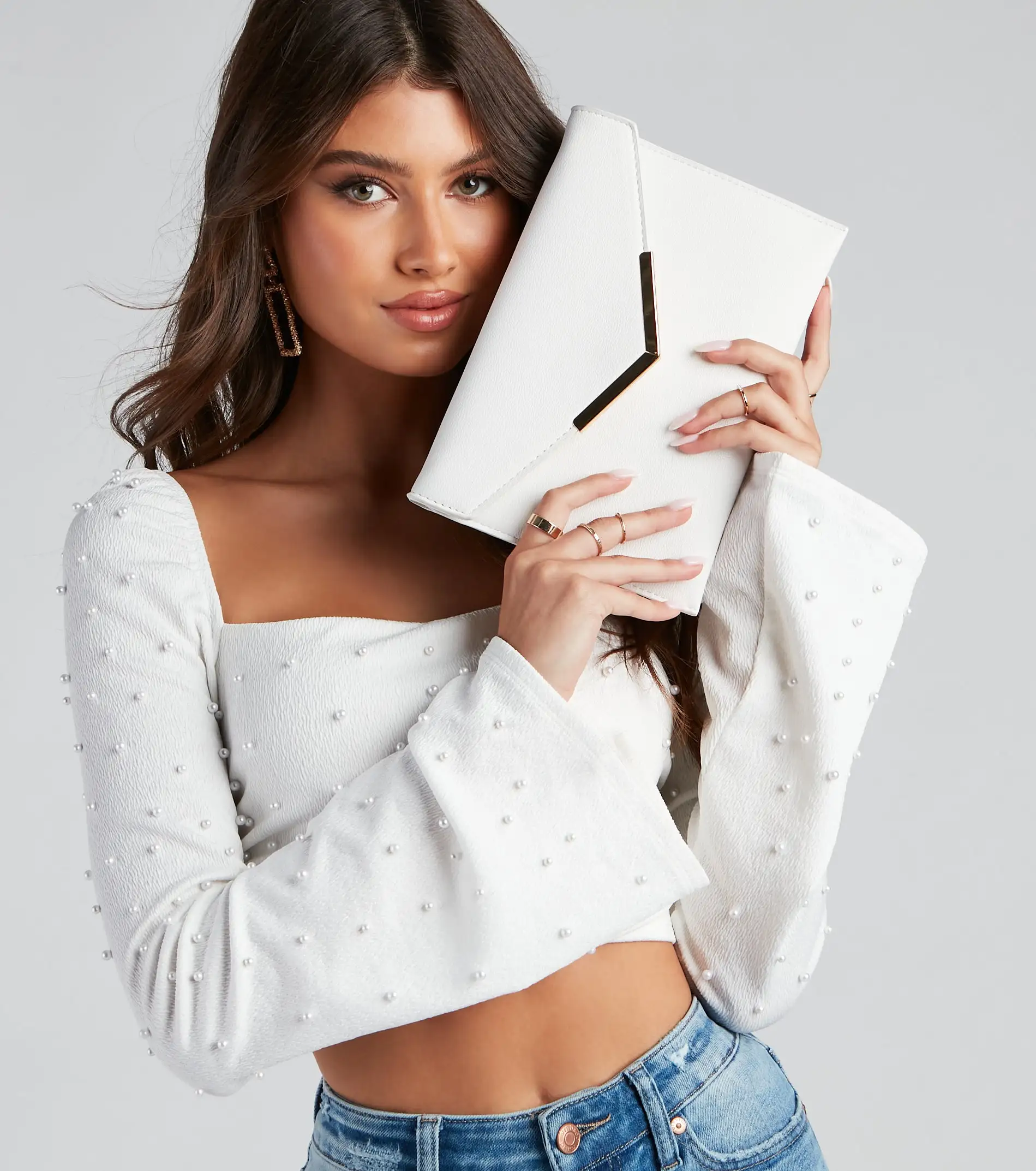 Clean and chic, keep your outfit classy with this essential faux leather clutch featuring an envelope flap with metal trim, snap-button closure, detachable chain-link strap, and a spacious interior with a zipper pocket. Complete the look in a