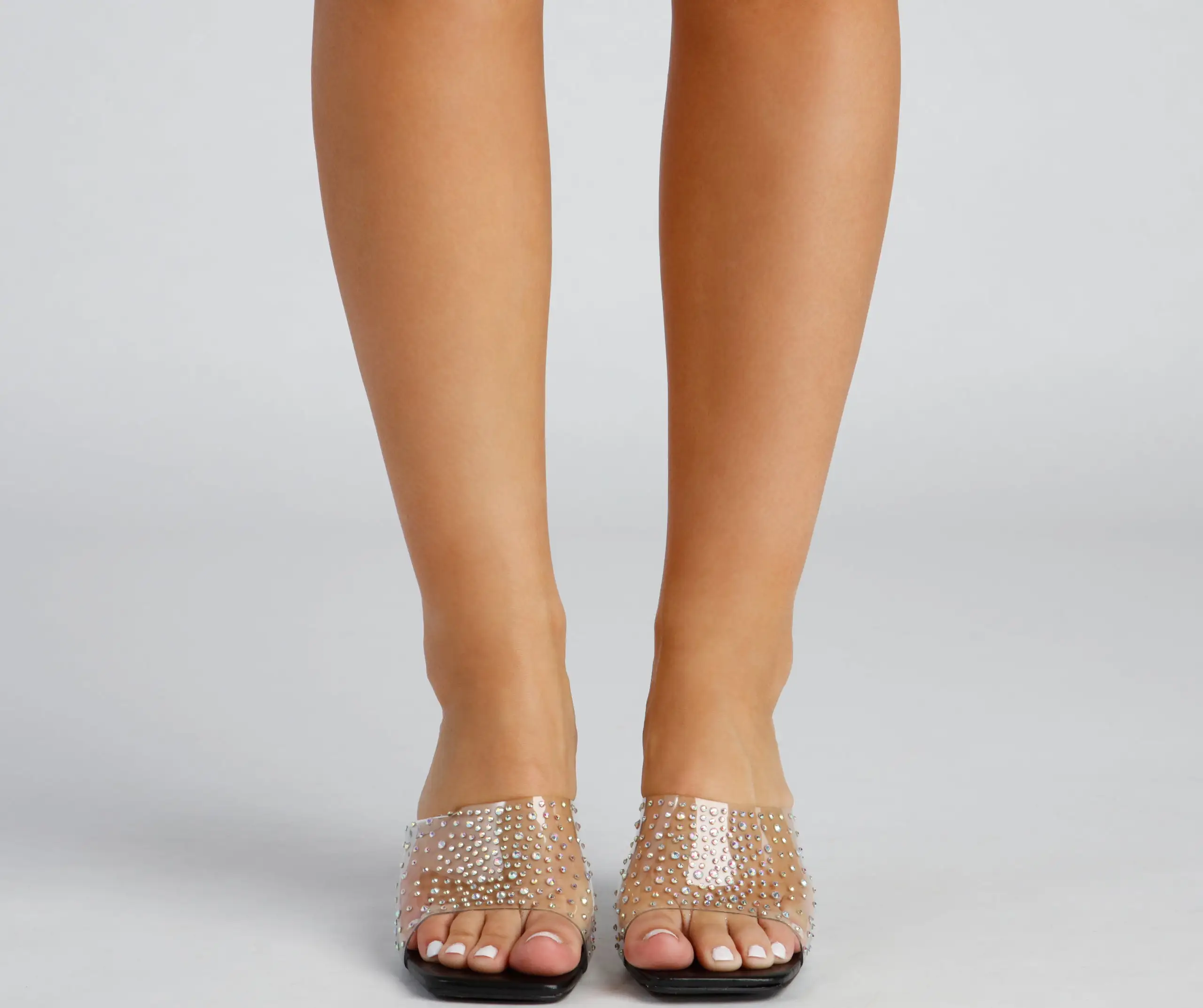 Sparkle in these trend-setting lucite mules featuring a square toe, rhinestone PVC strap, and a short stiletto heel. Complete the look in a stylish