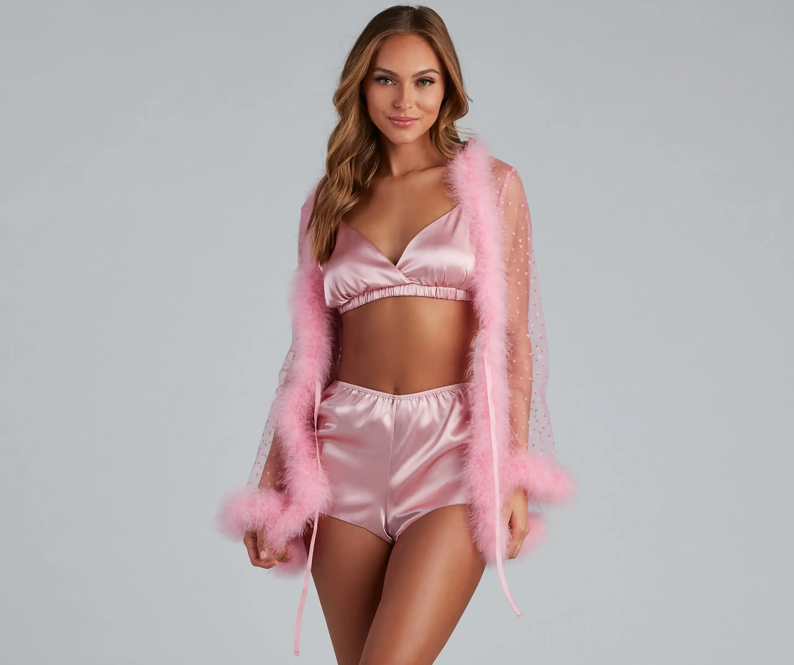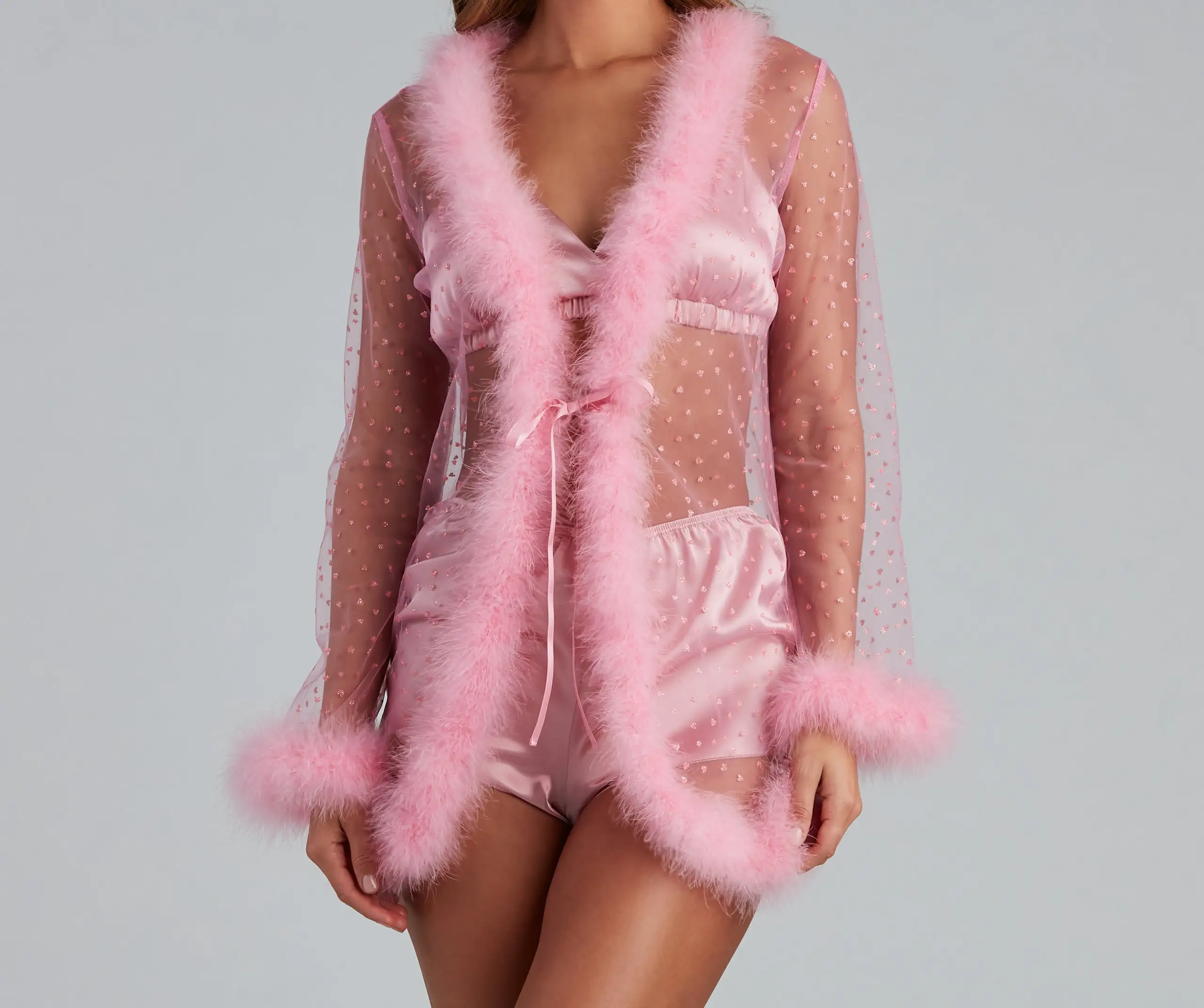 They’ll be crushing on you in this adorable robe that brings the flirty vibes! It features an open front with a chic marabou feather trim, a ribbon tie-front closure, long sleeves with matching marabou feather hems, a mid-thigh length with a relaxed fit, and an all-over mini glitter heart pattern on the sheer mesh fabric. Style this robe with a sexy
