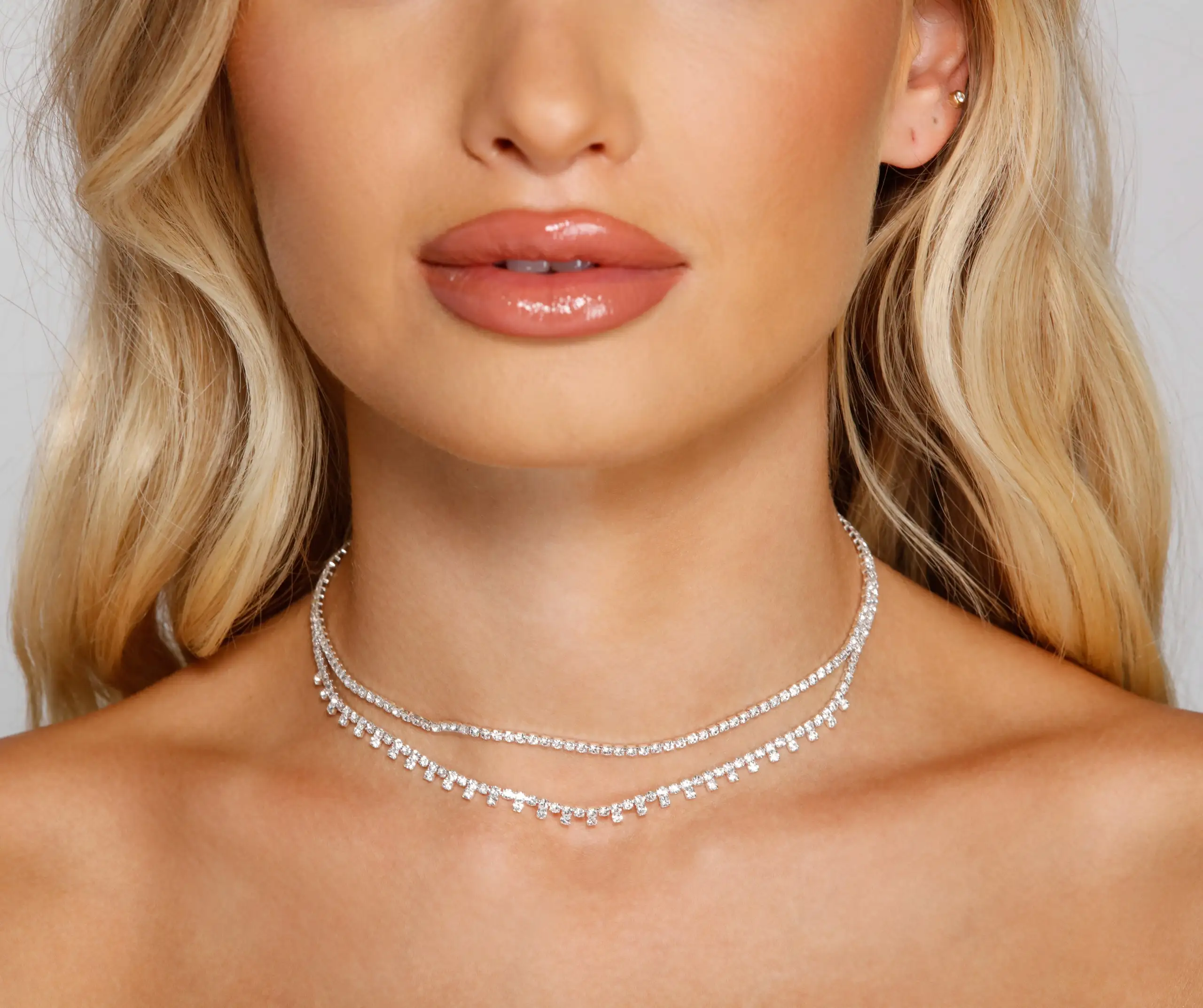 Accessorize your chic look with this dainty layered embellished choker necklace! It features a shorter layer with a single row of mini rhinestones and a slightly longer layer with a rhinestone drop design. Style this necklace with