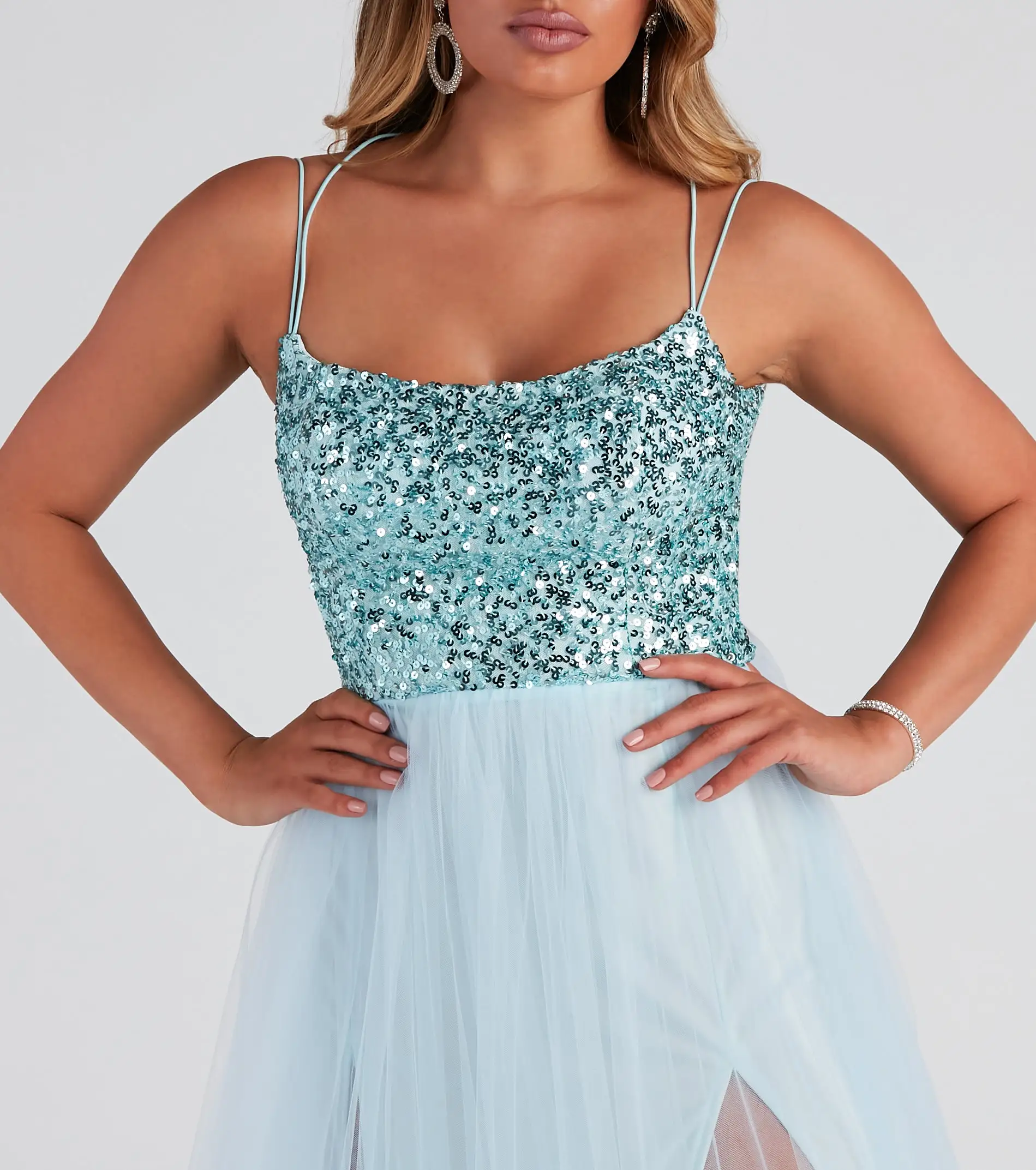 Daniella is absolute sparkly perfection! Create a princess moment in this stunning formal ball gown designed in a flirty, sleeveless square neckline with sleek bungee spaghetti straps that lead to her head-turning strappy open-back design. The sequin-knit bodice catches the light as you go from room to room while her A-line mesh skirt effortlessly sweeps the floor. Complete the look with an elegant