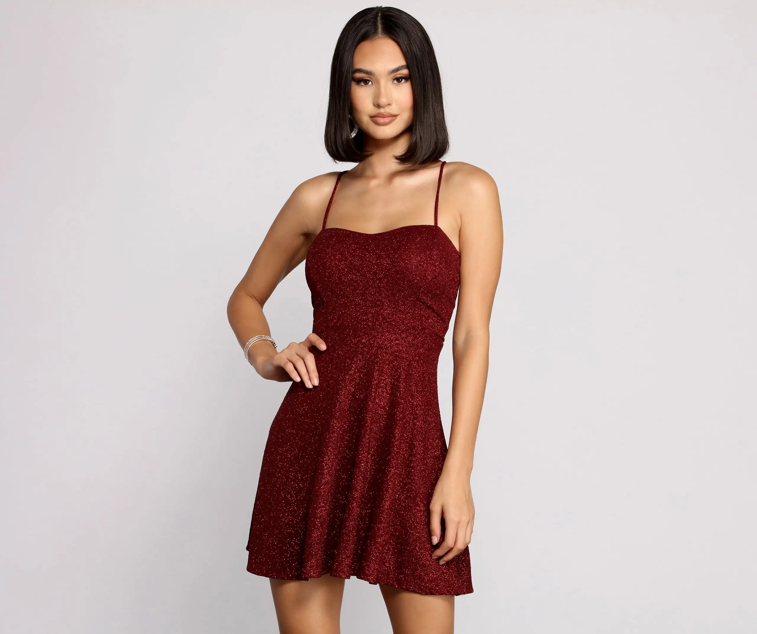 Glow and dazzle in a glitter dress that illuminates the night. This must-have dress features a sleeveless sweetheart neckline with a padded bust, sleek spaghetti straps that lead to a cross-back design, a dazzling lower back rhinestone embellished bar strap, and a mini-length skater skirt with a fit and flare silhouette. The glittering fabric perfectly styles with