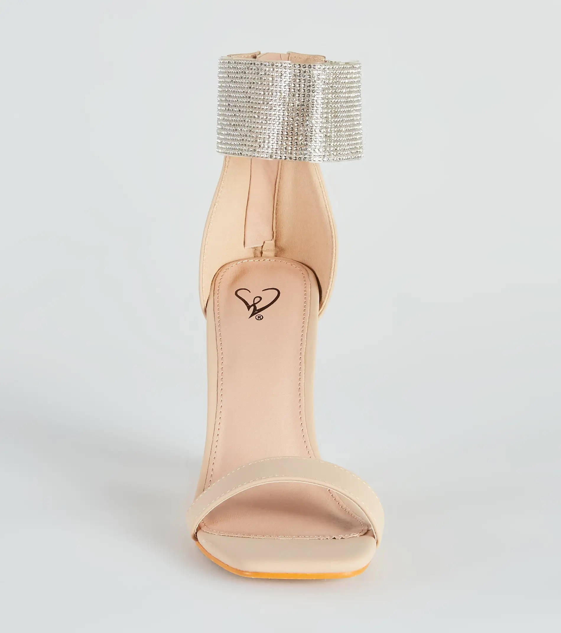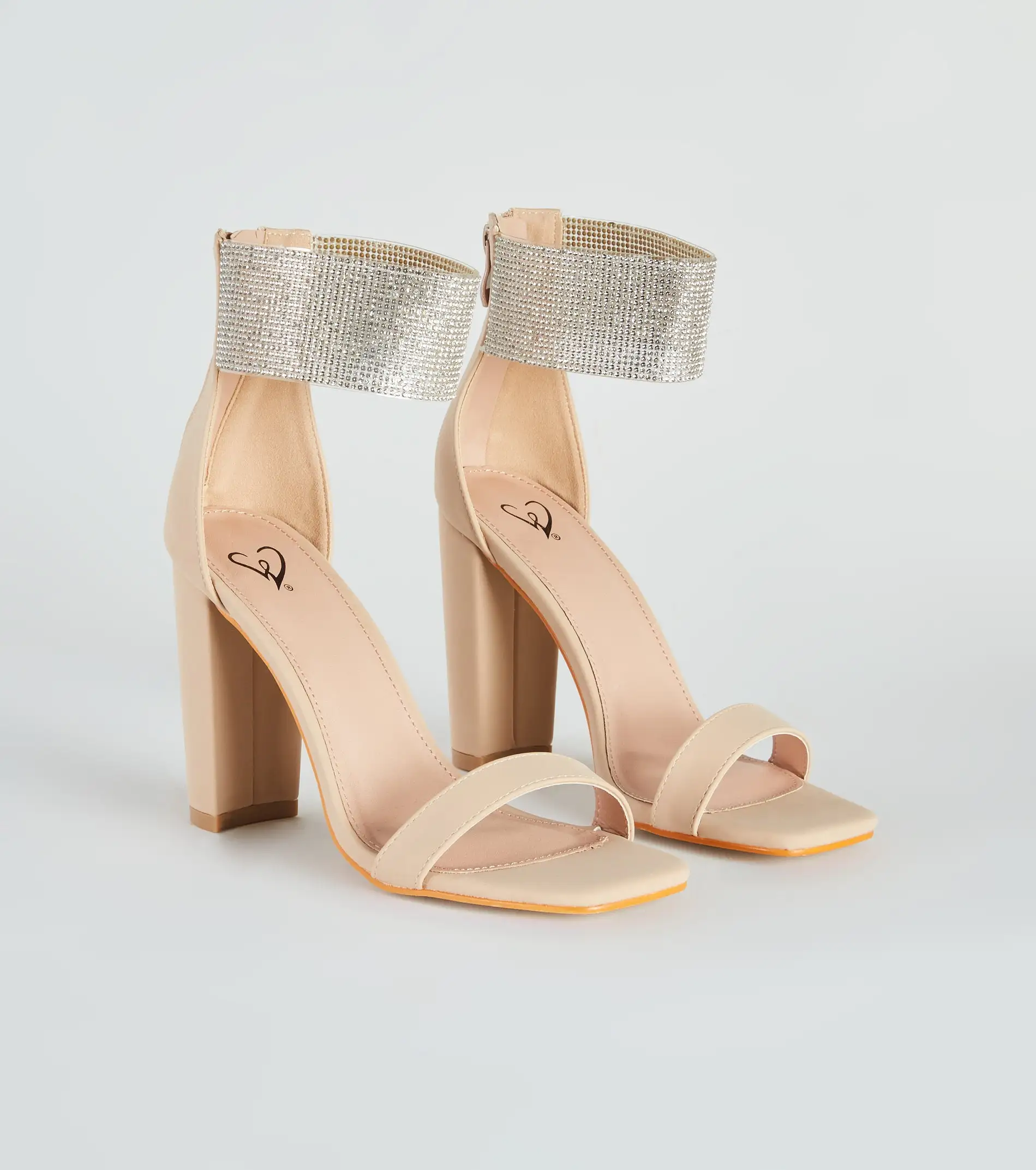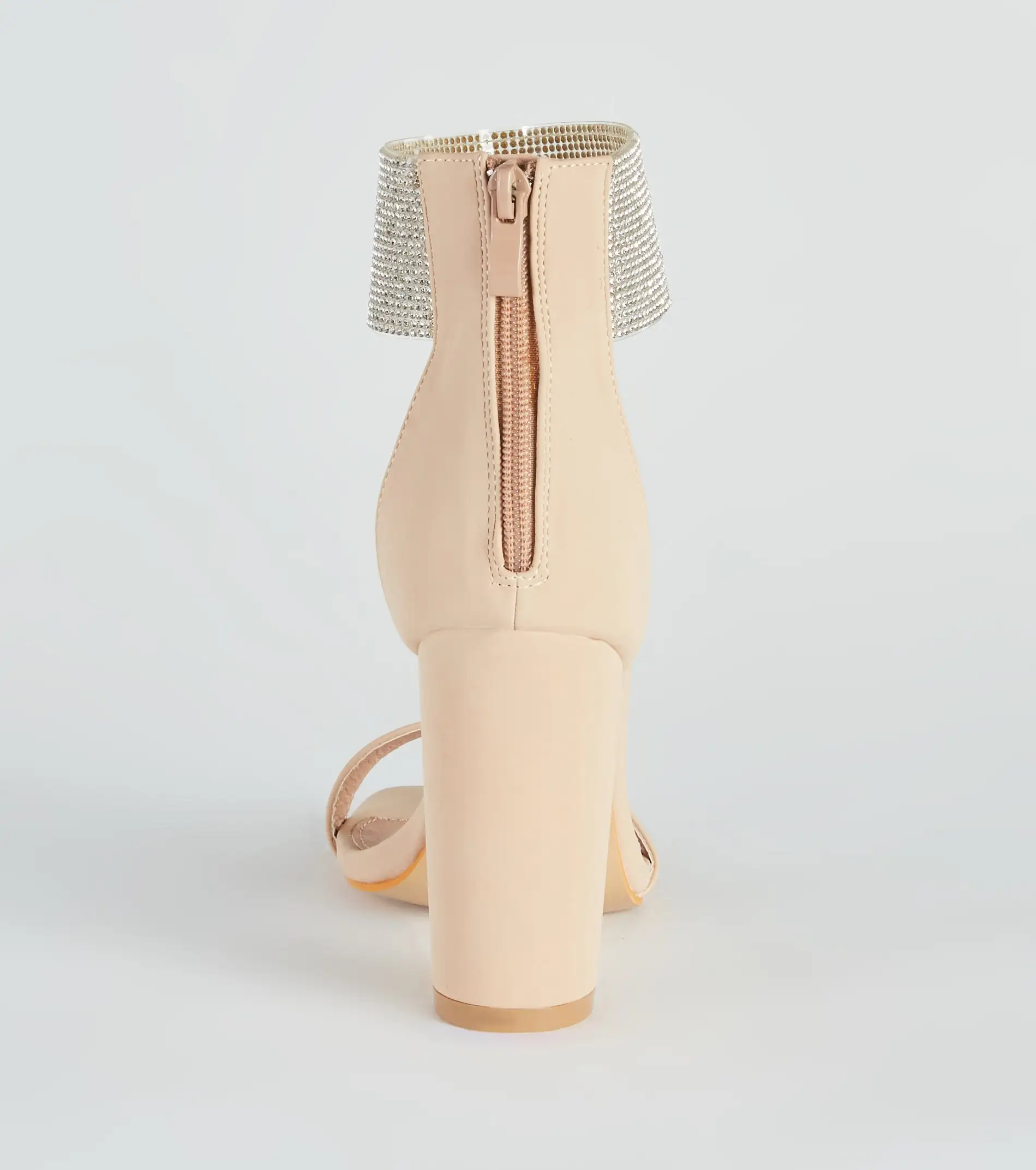 Bring the dazzle in these luxe heels that elevate your look. The heels feature a wide ankle strap embellished with mini rhinestones, a zippered back, a square toe with a strap over the toe, and a block heel. The heels are composed of a faux nubuck material. Complete the look with a
