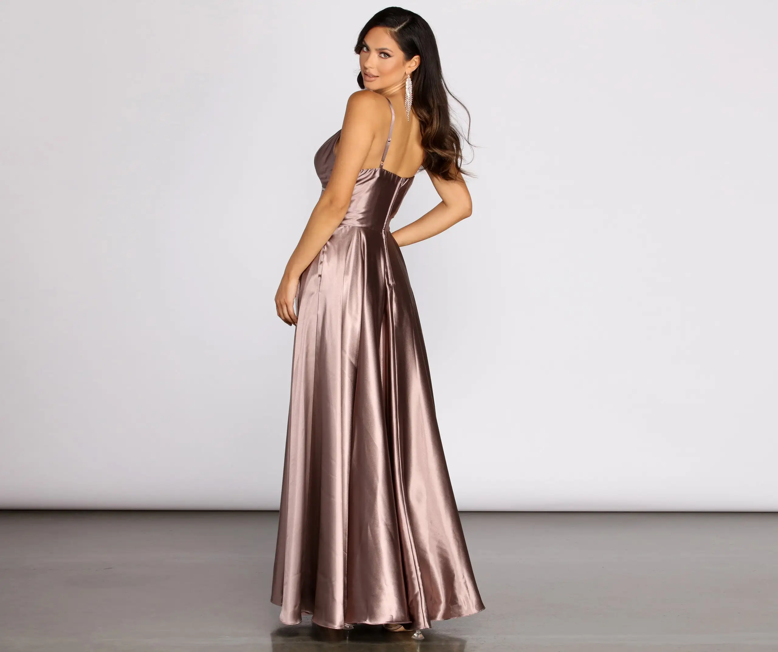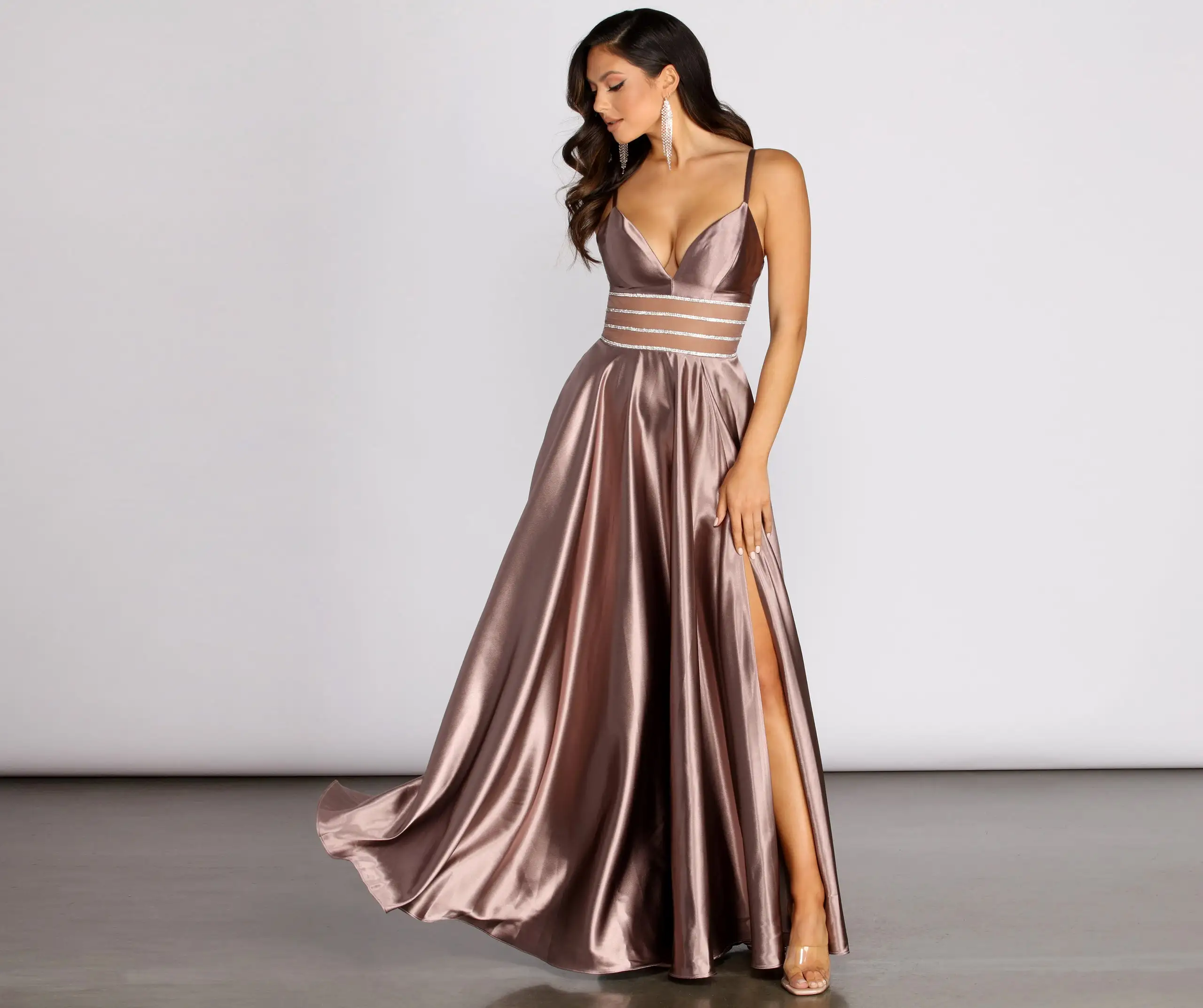 Everyone’s eyes won’t be able to avoid the pretty luster shining from Delaney’s smooth and sleek satin composition. A sheer mesh inset accented by three rows of twinkling rhinestones hugs her fitted bodice. The best part is her convenient hand pockets for stowing away your phone and lipstick!Â