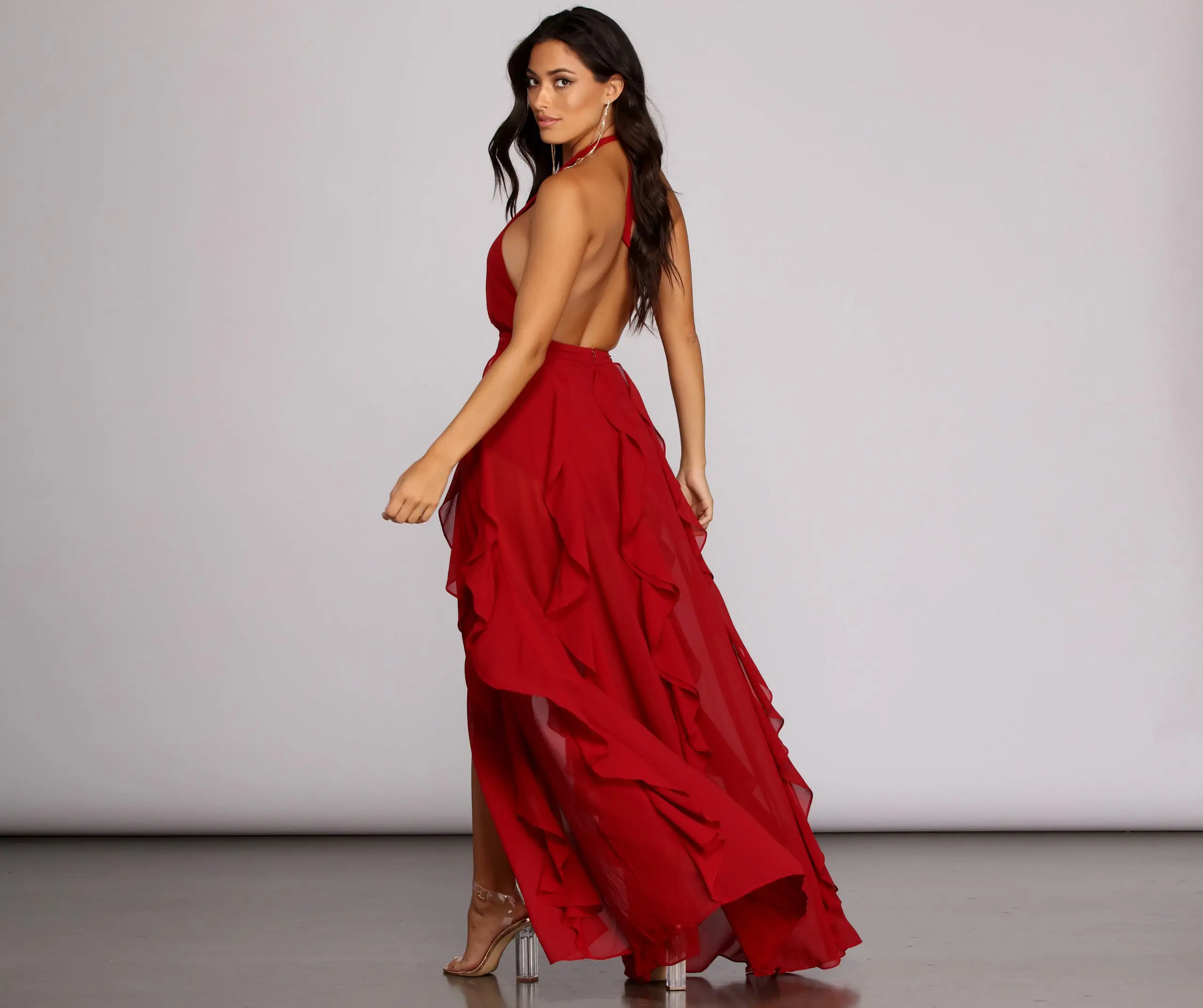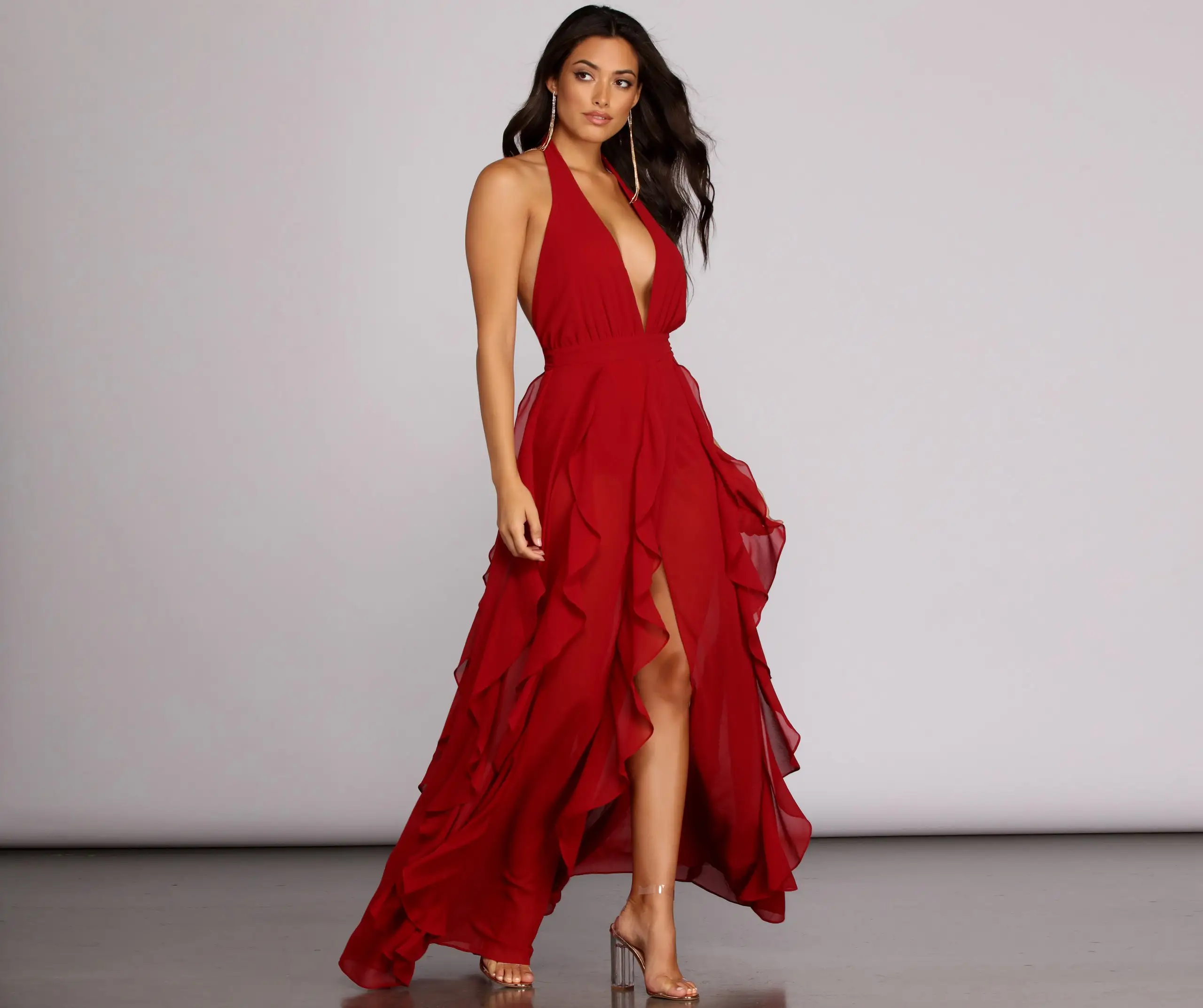 Create a twirl worthy moment in our charming Delena dress! She features an all over emerald green hue, a halter neckline with wide neck tie straps, a plunging V neck bust and an open back. Her slim fit bodice leads to a sweeping floor length silhouette accented with dreamy tendril accents and a high slit. She includes a built in bodysuit lining with a thong bottom and snap button closure. Dress is composed of a lined chiffon fabric that offers a relaxed fit with minimal stretch. Includes a lower back zipper closure.