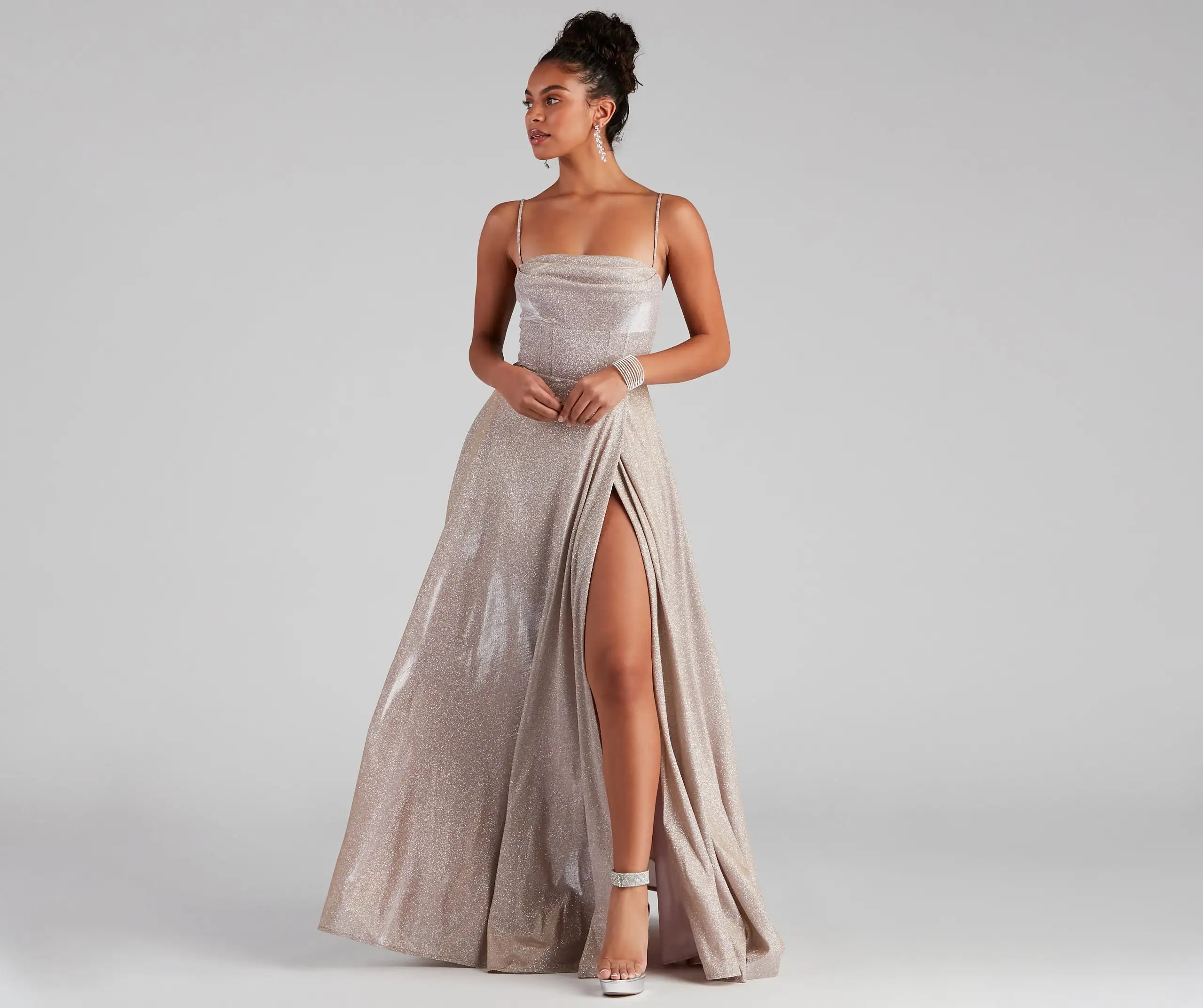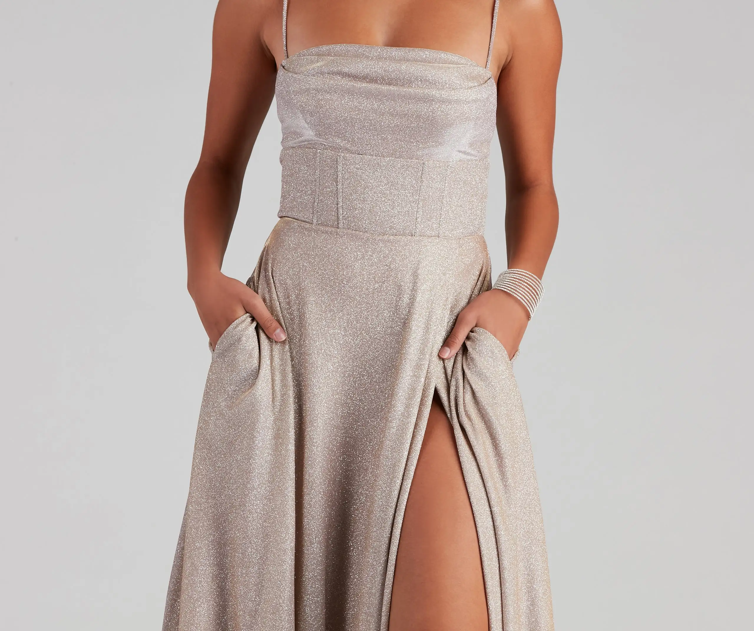 You’re not wrong for wanting to glow this prom season! The Denice Corset A-Line Wrap Formal dress will have you feeling sparkly all night. She features a sleeveless cowl neck, adjustable spaghetti straps that let you customize her fit, and a corset-style bodice with flexible boning. Keep your hands warm in the hidden side pockets. Her empire waist leads to the A-line, floor-length silhouette on a shimmering glitter satin-lined fabric with no stretch. Complete the look in