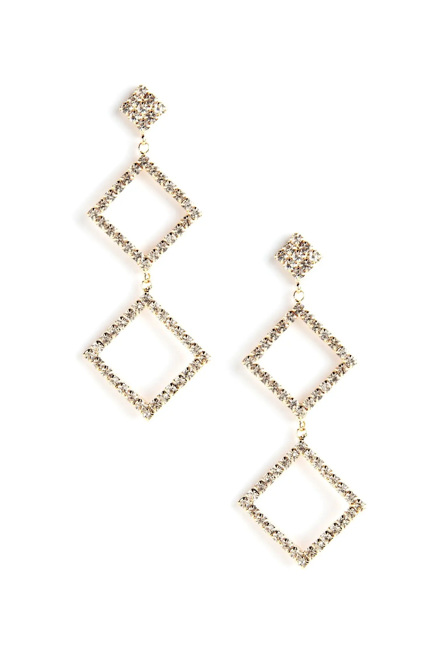 These diamond rhinestone dusters are the perfect finishing touch to your glam look! The gold earrings feature a diamond shaped post with two diamond shaped open pieces attached, adorned with sparkling rhinestones. Include a post back closure.