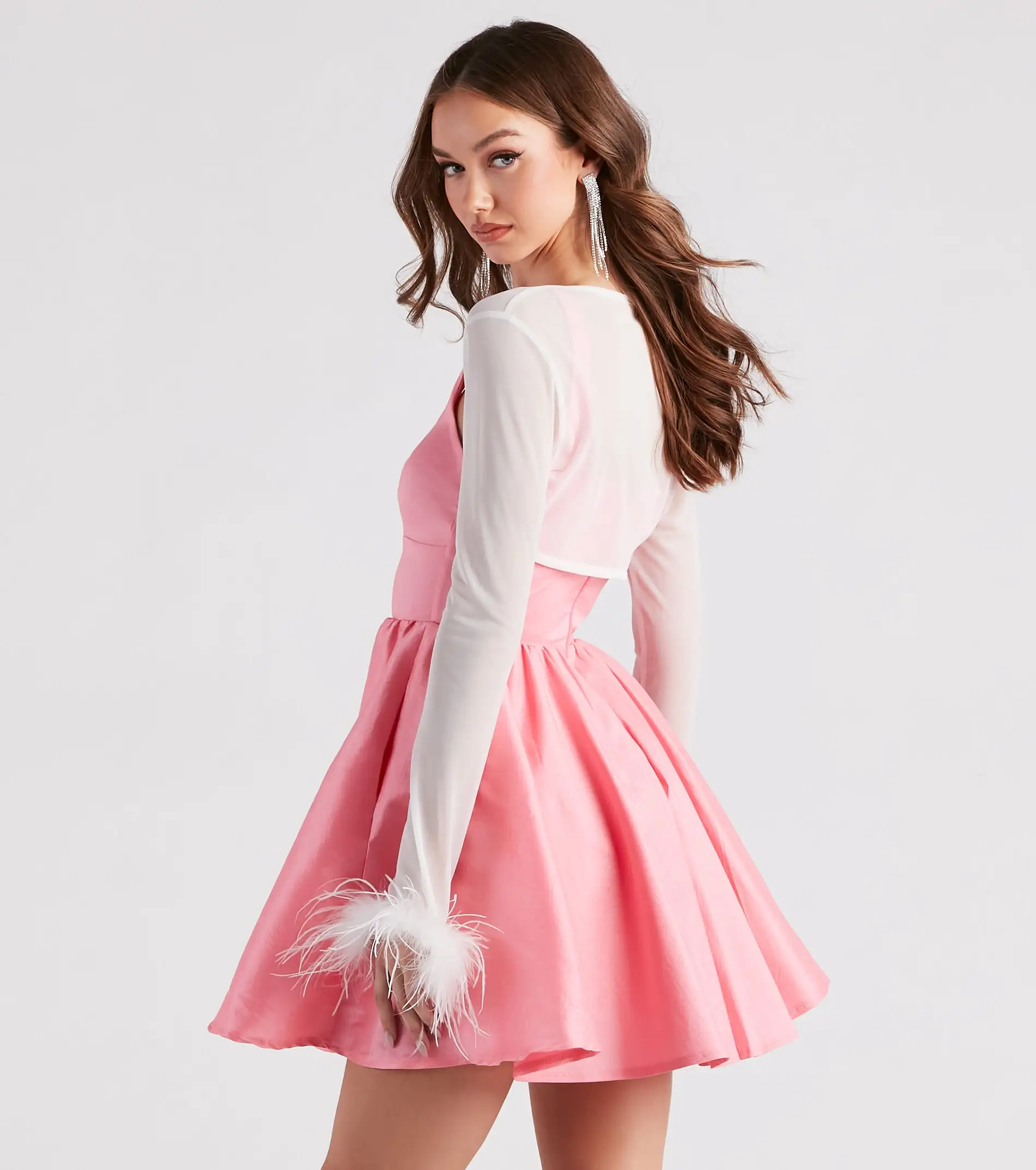 Embrace your diva-darling status by layering on this mesh bolero over your formal dress! It features fitted long sleeves with a marabou feather trim, an open front design, and an ultra-cropped hem. Complete the look with