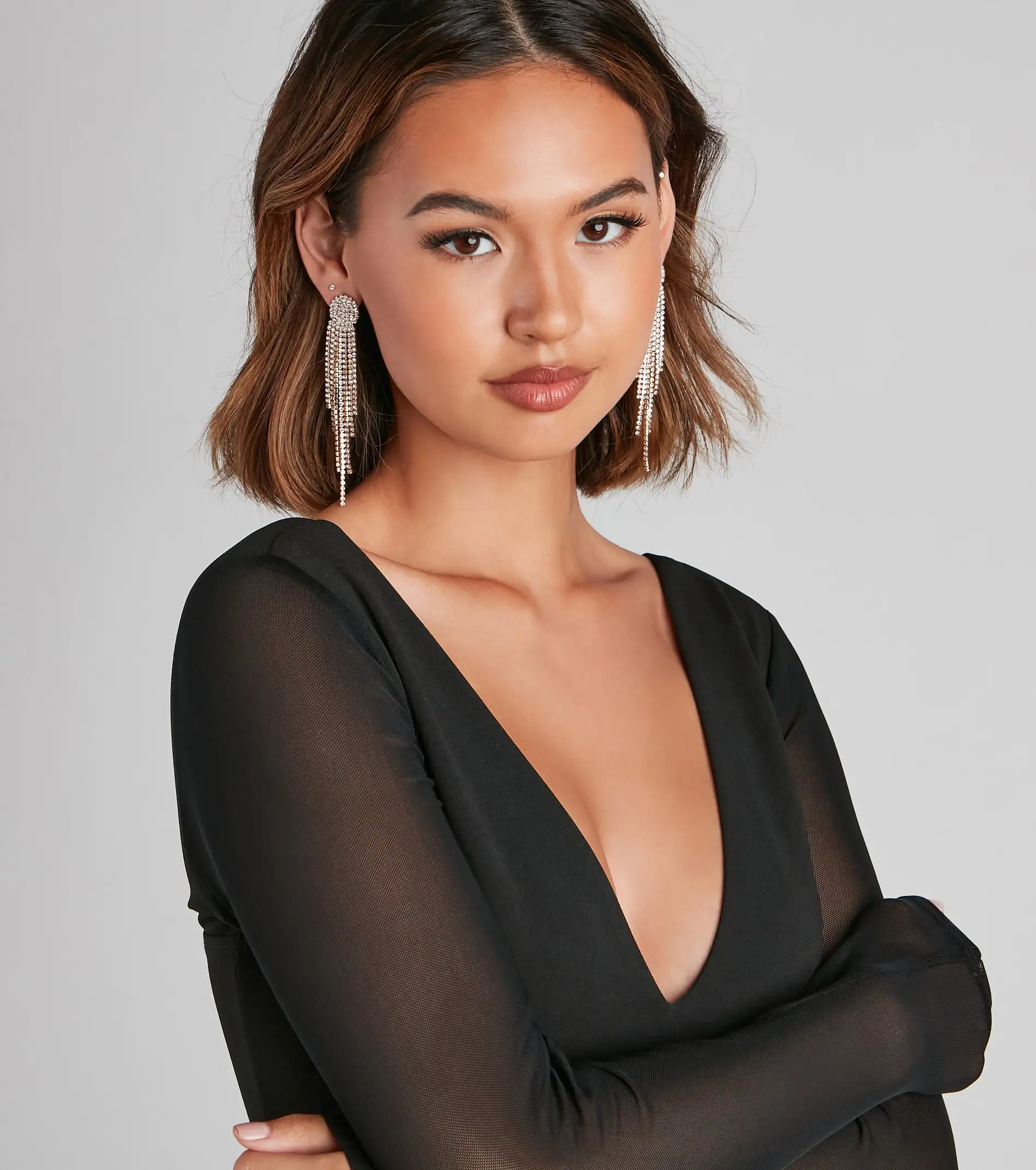 Embrace your divine beauty in these rhinestone fringe earrings! They feature a circle post with cascading fringe and a post-back closure. Complete the look in a flowy