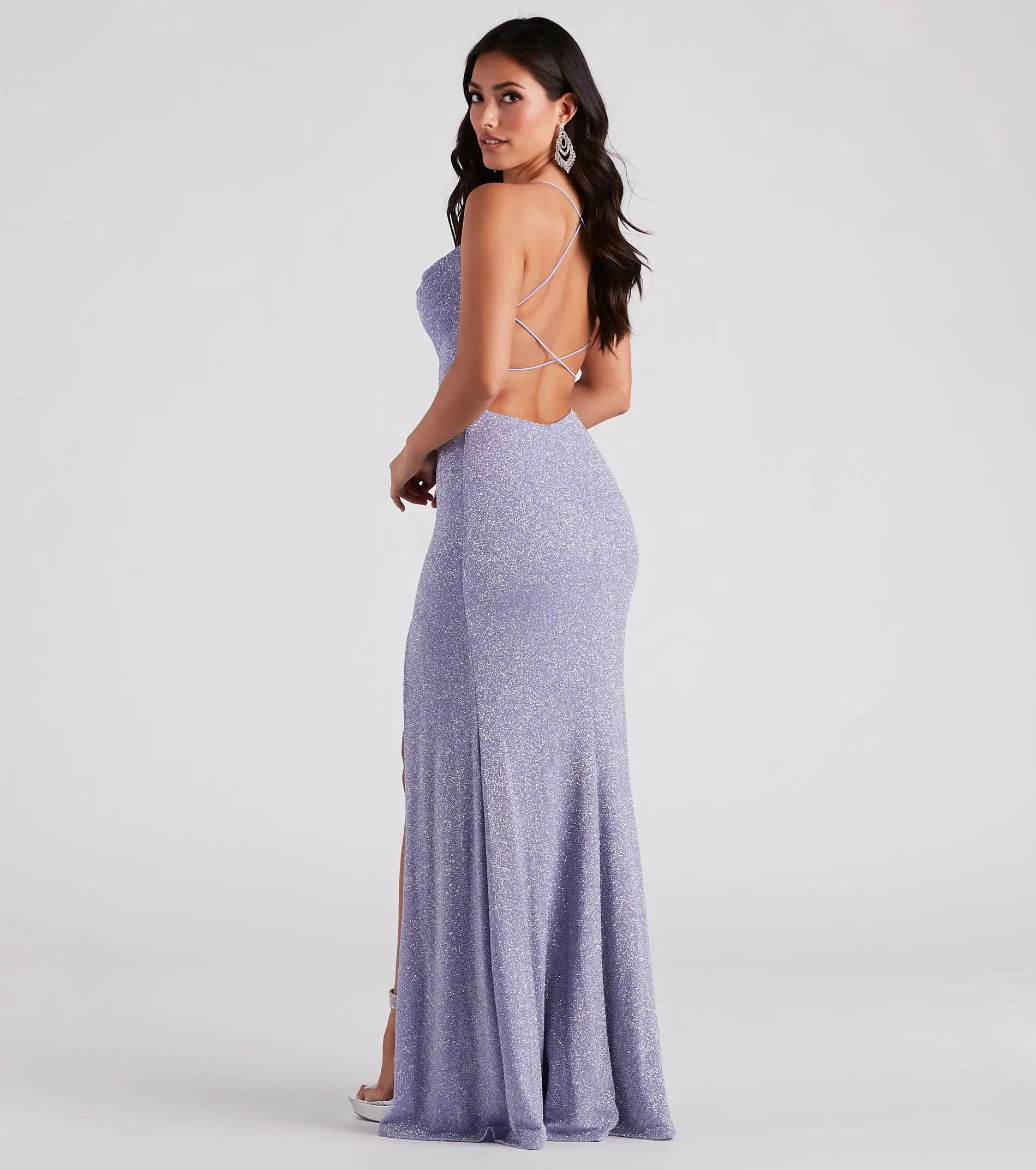 Radiate glamour from the moment you enter with a glittery dress that brings you into the spotlight. Doria features a sleeveless cowl neckline, sleek bungee spaghetti straps that cross at the back, lower back cross straps, and an A-line silhouette with a high side slit. The dress is composed of a lurex glitter knit fabric that offers a form-hugging fit with moderate stretch. Complete the look with