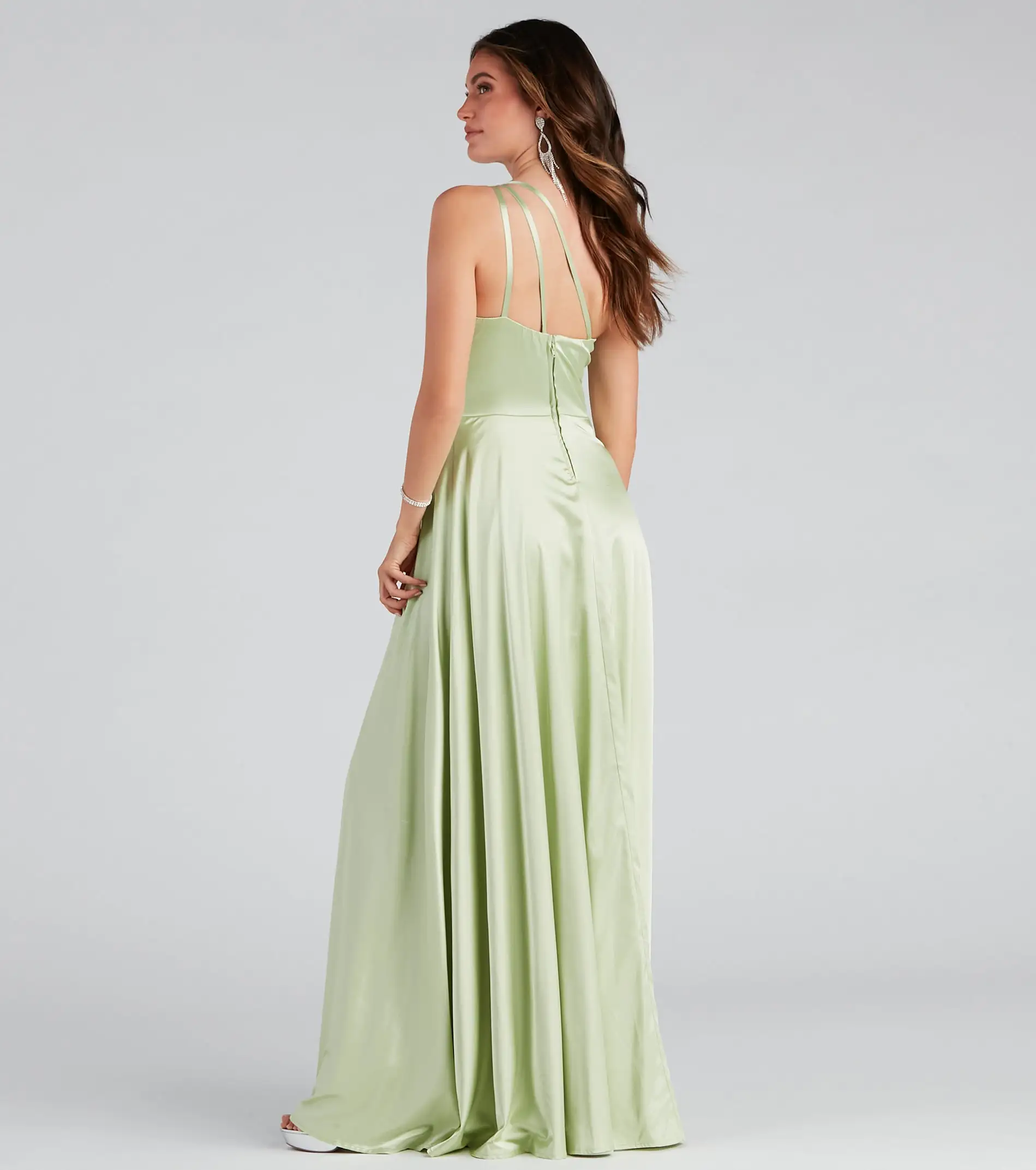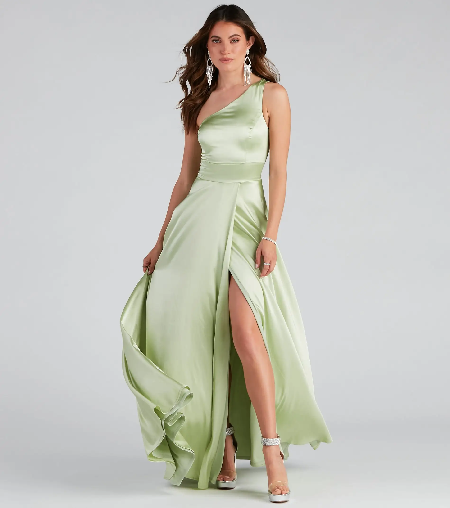 The Dorothy formal satin dress will radiate sophistication for your special prom night! She features a sleek one-shoulder strap with a strappy back, a built-in padded bust, and an empire waist. Her figure-flattering A-line silhouette leads to the floor-length hem with a high-cut front slit for a sultry show of leg. Complete your prom look in an elegant