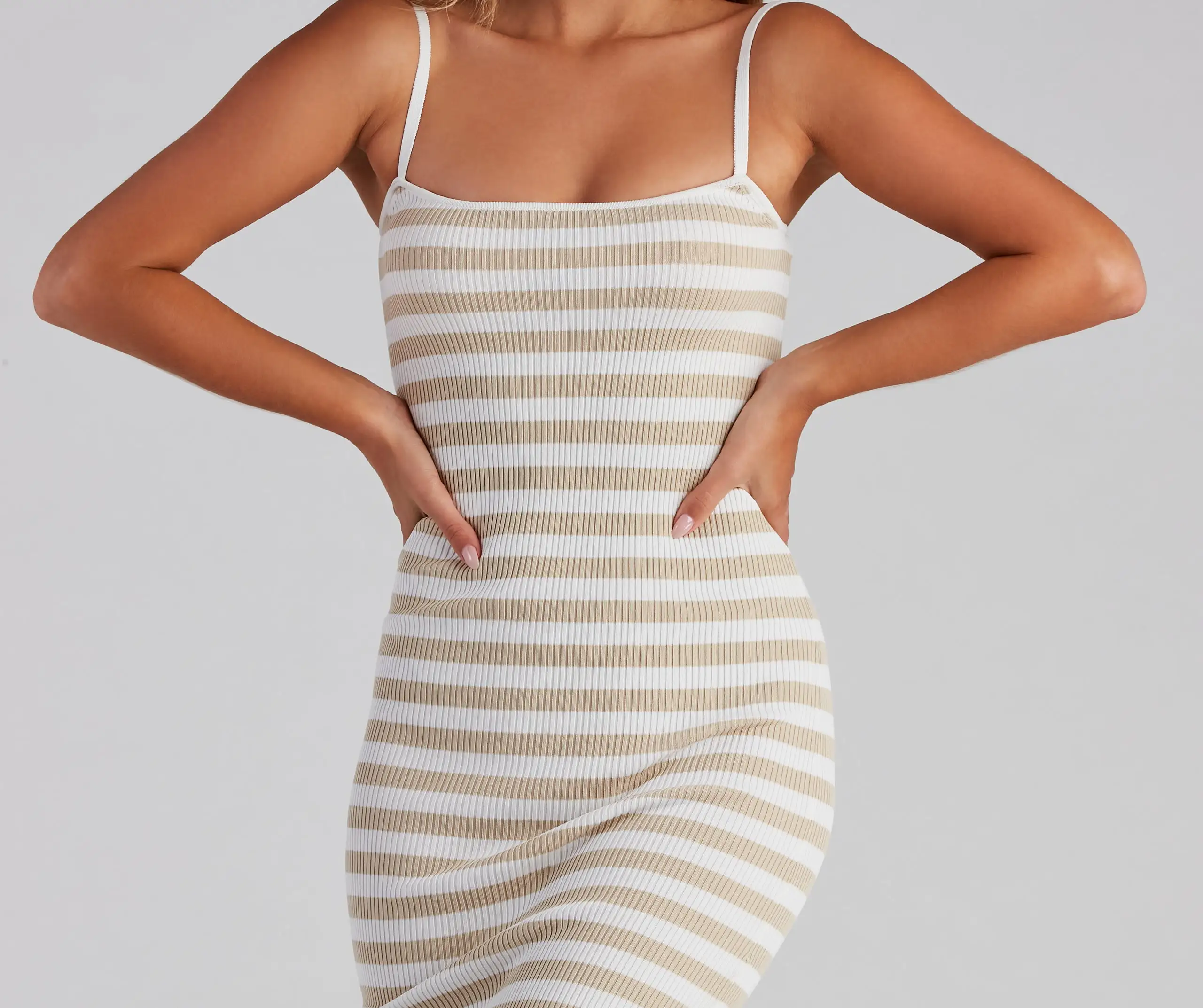 Earn your stripes in style rocking this sweater midi dress for all-day slays! It features a sleeveless square neck, adjustable spaghetti straps, a striped pattern, and a bodycon silhouette. Composed of a rib-knit fabric with a moderate stretch. Style with chic